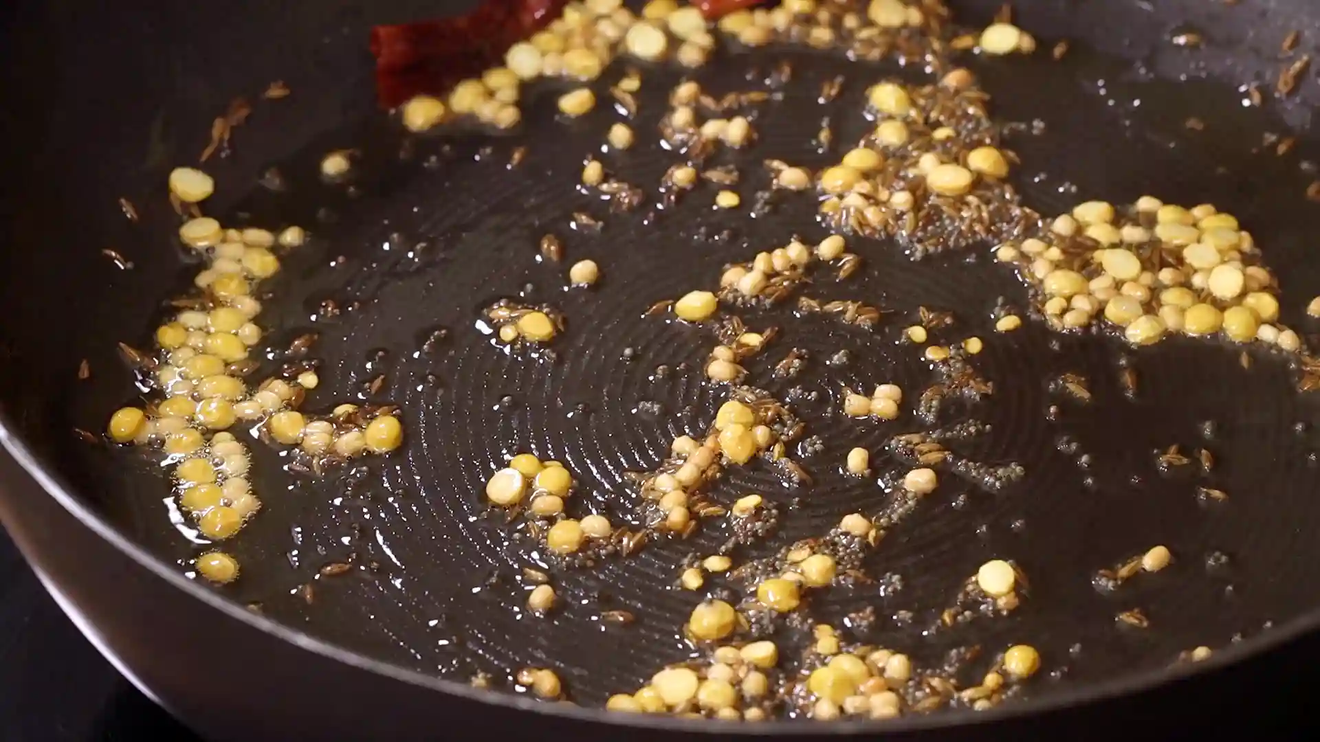 Heat oil in a wide pan and add chana dal, urad dal, mustard seeds, cumin seeds and red chillies. Roast until aromatic.