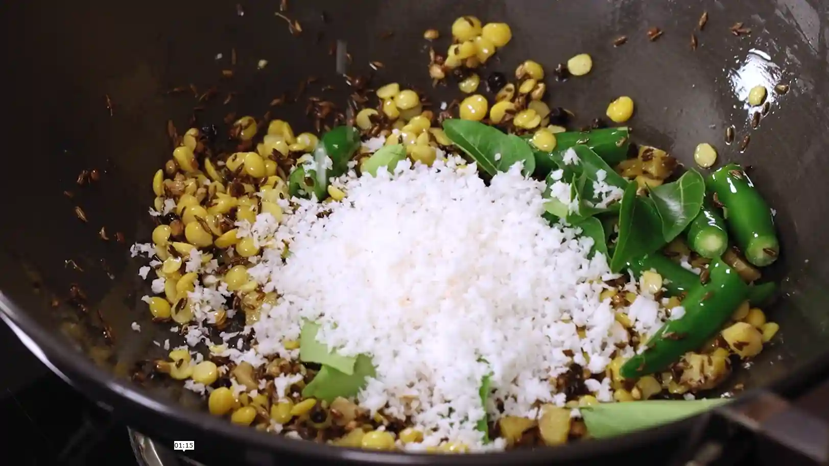 Once the soaked dals, ginger, green chillies, coconut, and curry leaves join in, everything smells nutty and comforting. The beaten curd is added gently and mixed on low heat; this step helps everything blend smoothly without splitting.