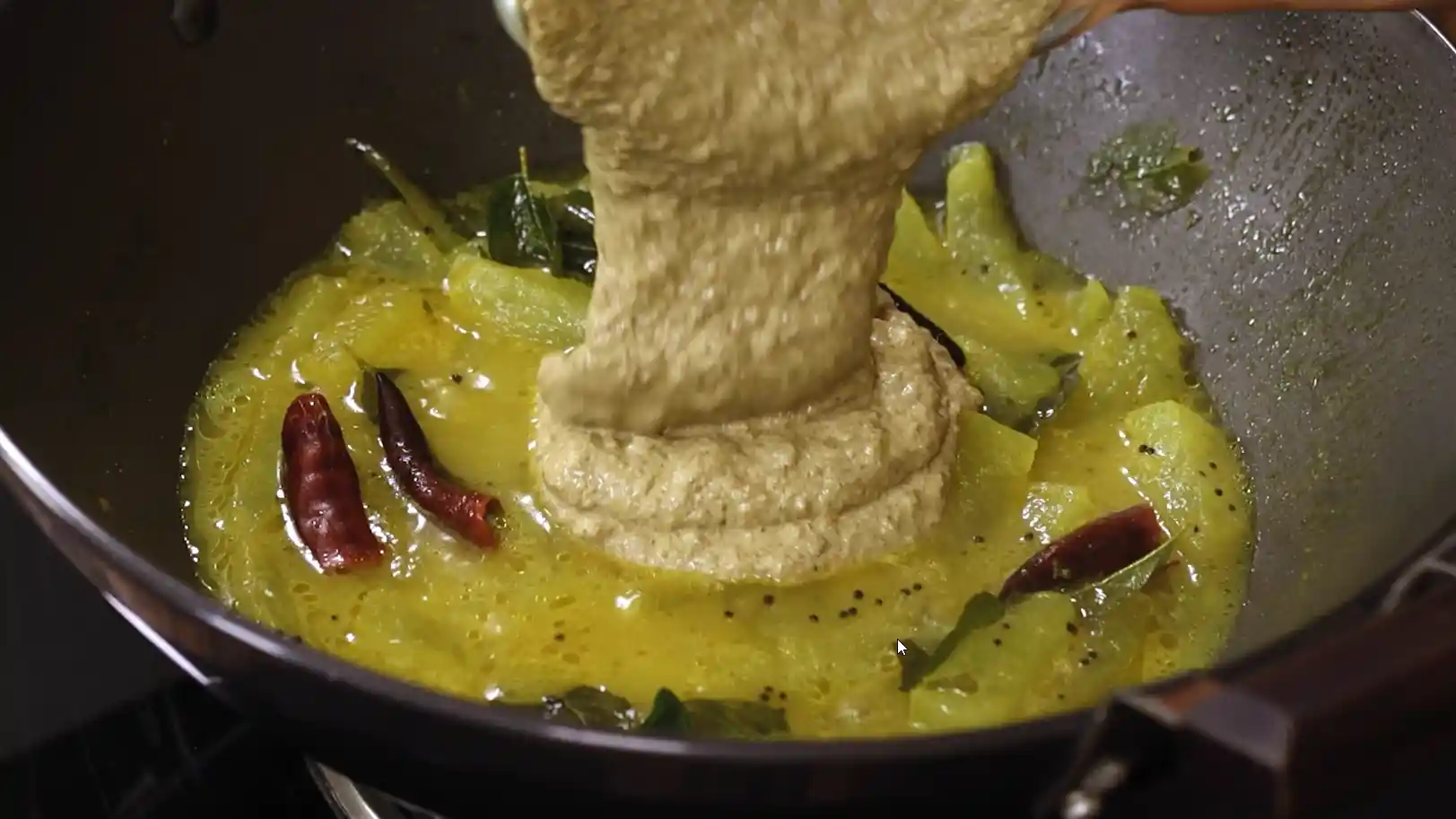 After cooling, this mixture is ground into a silky paste that becomes the backbone of the kuzhambu.