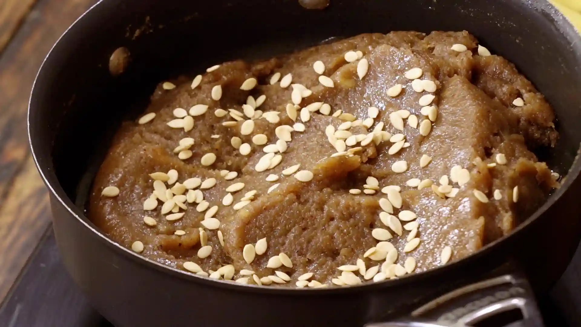 As the halwa cooks, it deepens in color, turns glossy, and begins pulling away from the pan. Ghee is added toward the end, not at the beginning, so the halwa stays rich but not greasy. Finally, melon seeds are folded in, and the halwa is cooked just until cohesive and shiny.