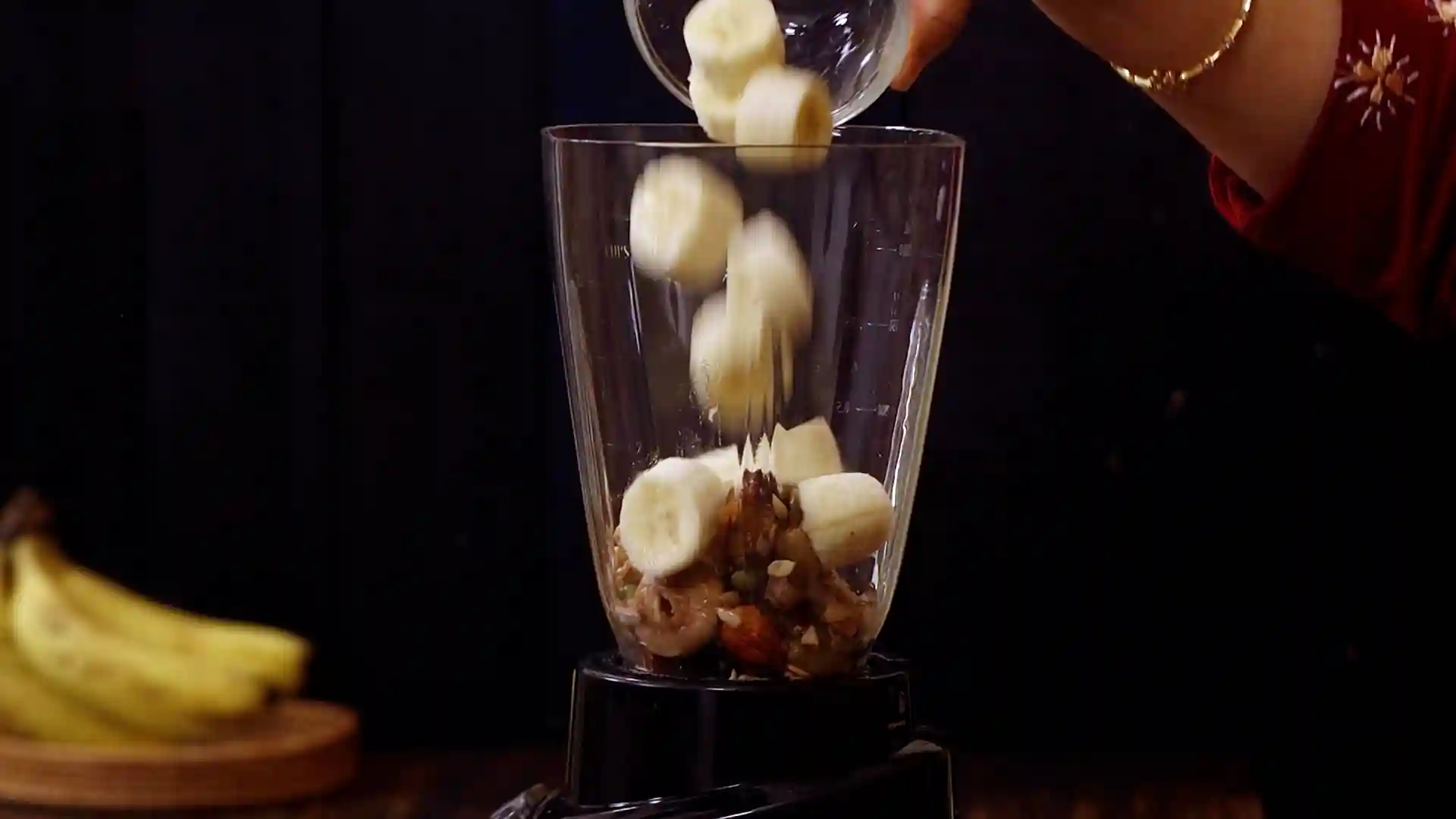 Transfer soaked dry fruits, seeds, and chopped banana into the mixer jar