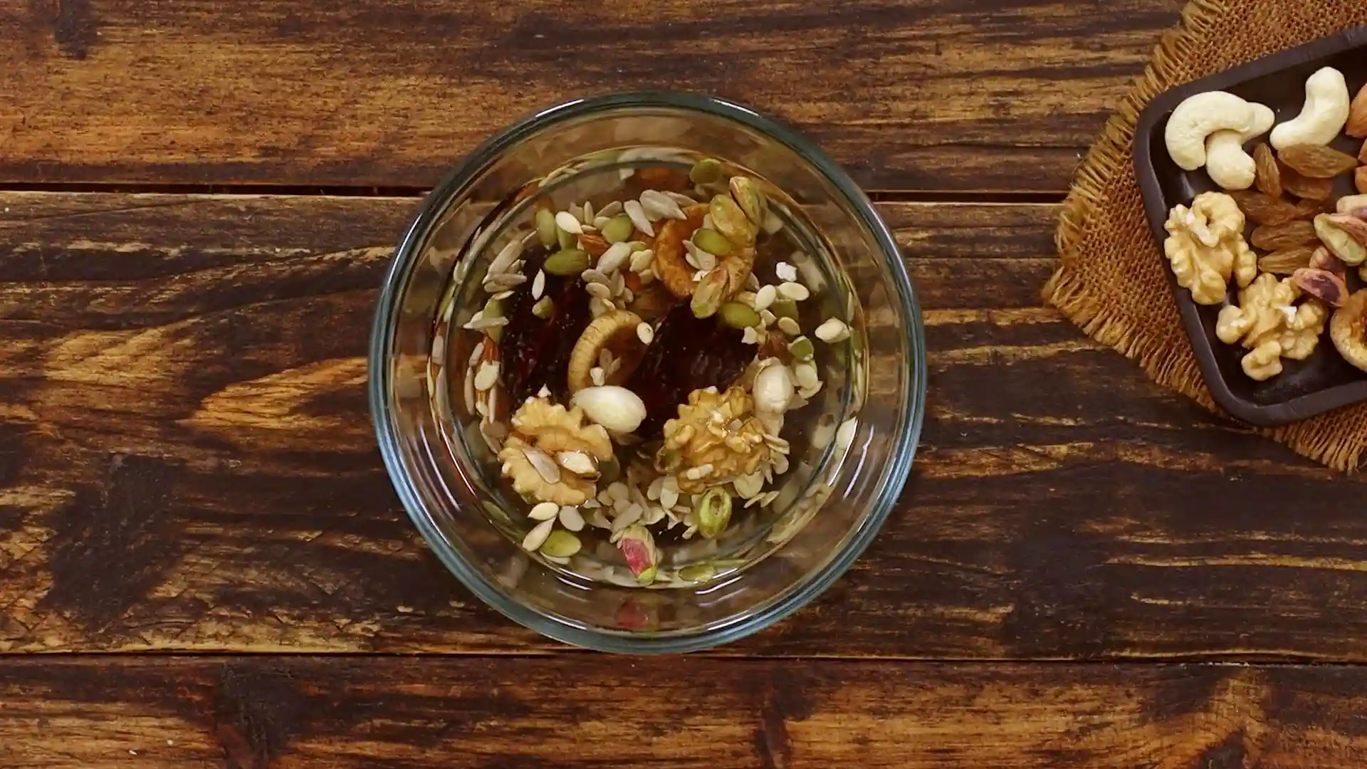You start by soaking all the nuts, seeds, and dry fruits overnight. This step is not optional if you want: