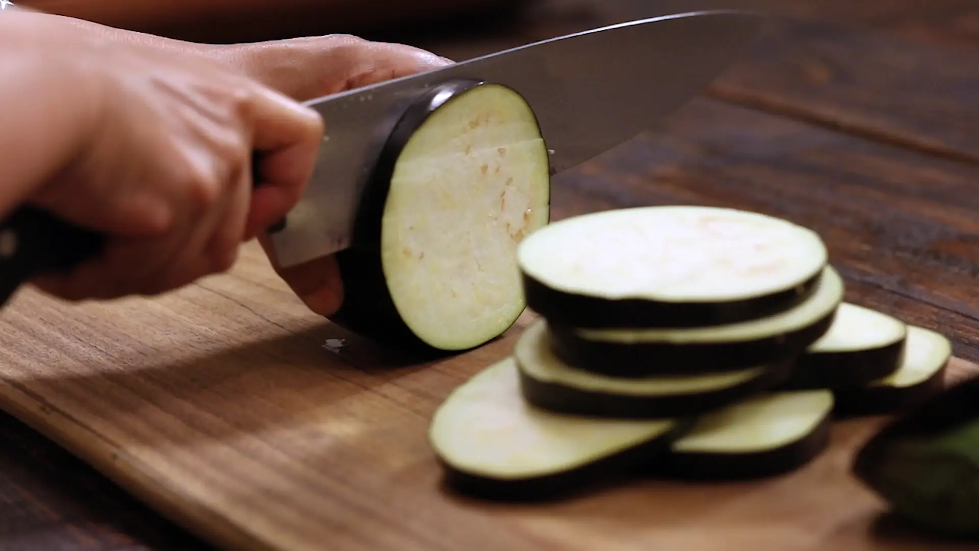 Slice the brinjal into even rounds — not too thick, not paper thin. You want them to hold up in the pan and still cook through without burning.