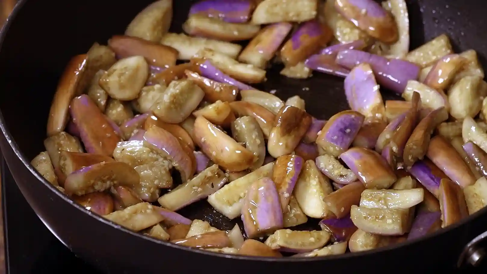 In the same pan, heat oil and add soaked brinjals, sauté until soft -