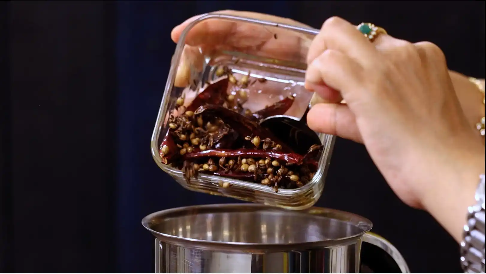 You start by heating oil in a pan and gently roasting coriander and cumin seeds. This isn’t about browning, it’s about waking up the spices. Once the aroma hits, the dry red chilies go in briefly and everything is set aside to cool.