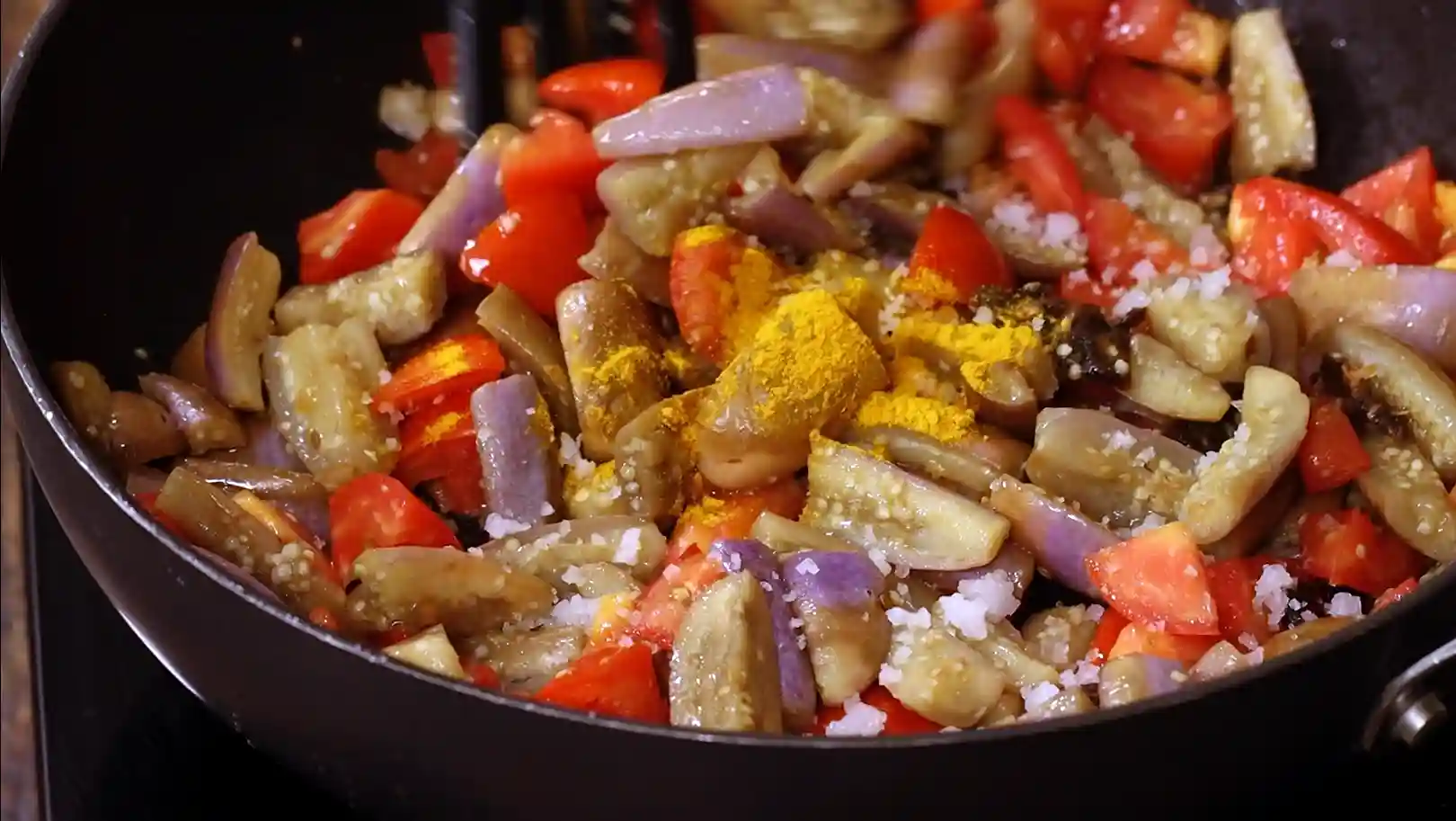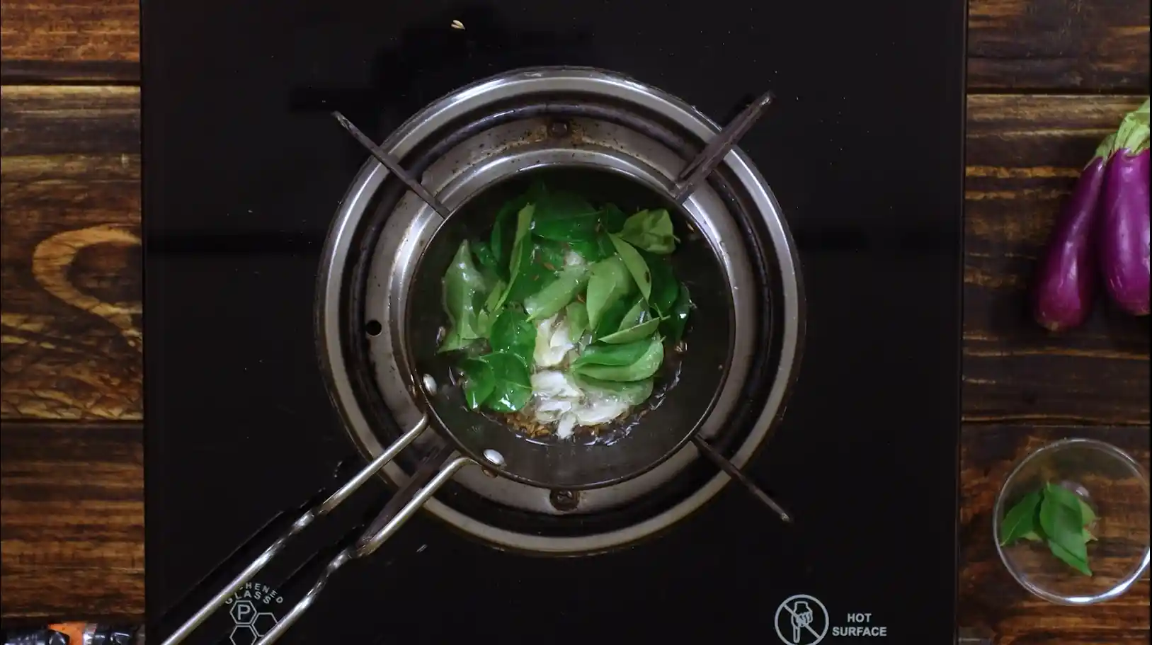 In the same pan, the brinjals take center stage. Because they’ve been soaked earlier, they cook evenly without browning too fast. As they soften, chopped tomatoes, tamarind, turmeric, and salt join in. The mixture slowly collapses into a soft, spoon-mashable base.