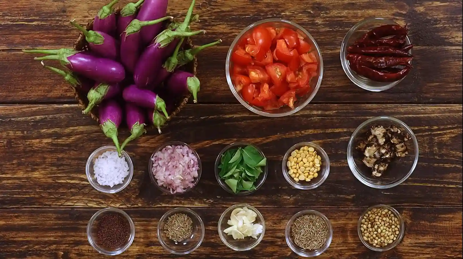 - Brinjal (Vankaya): The backbone. When cooked till soft, it gives body and natural richness.