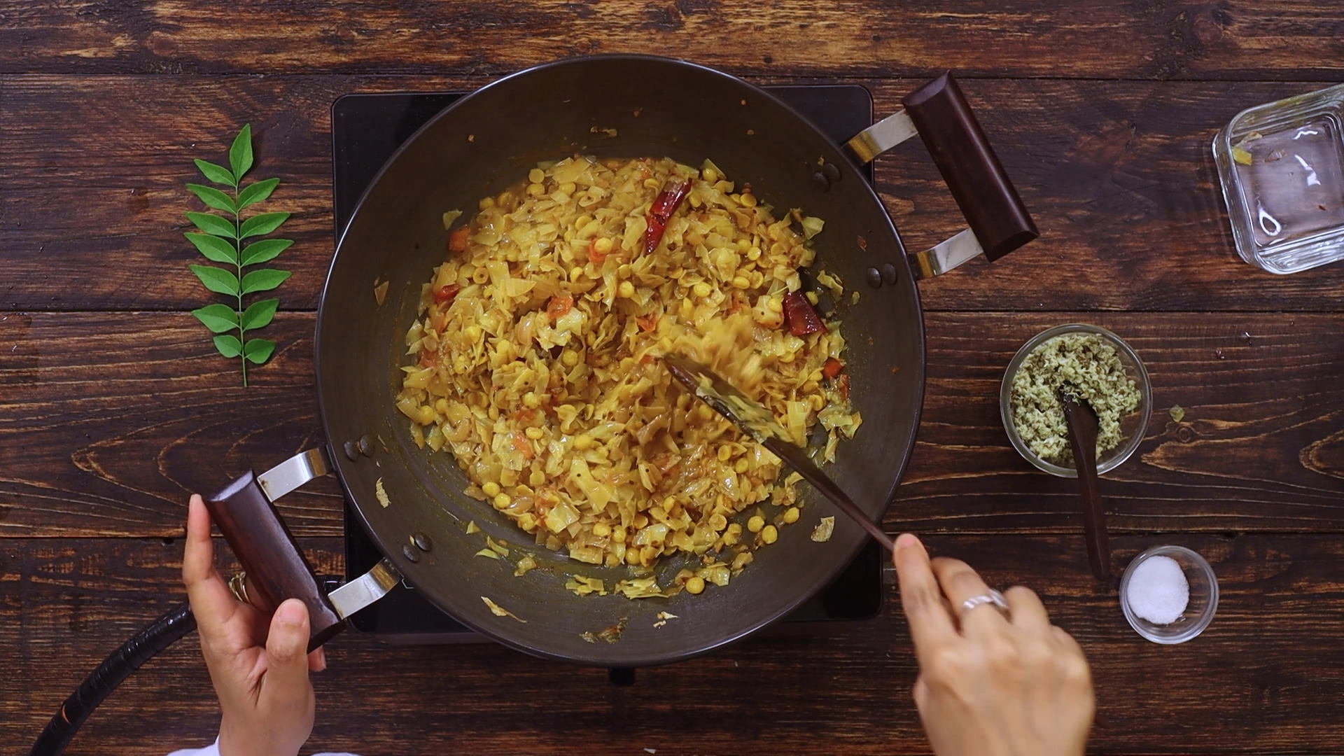 Next, fold in the cooked dal with its cooking water—this creates your curry base. Simmer until the cabbage is tender but not mushy. Swirl in your coconut‑cumin paste, cook briefly so flavors marry, and finish with curry leaves for that final aromatic lift.