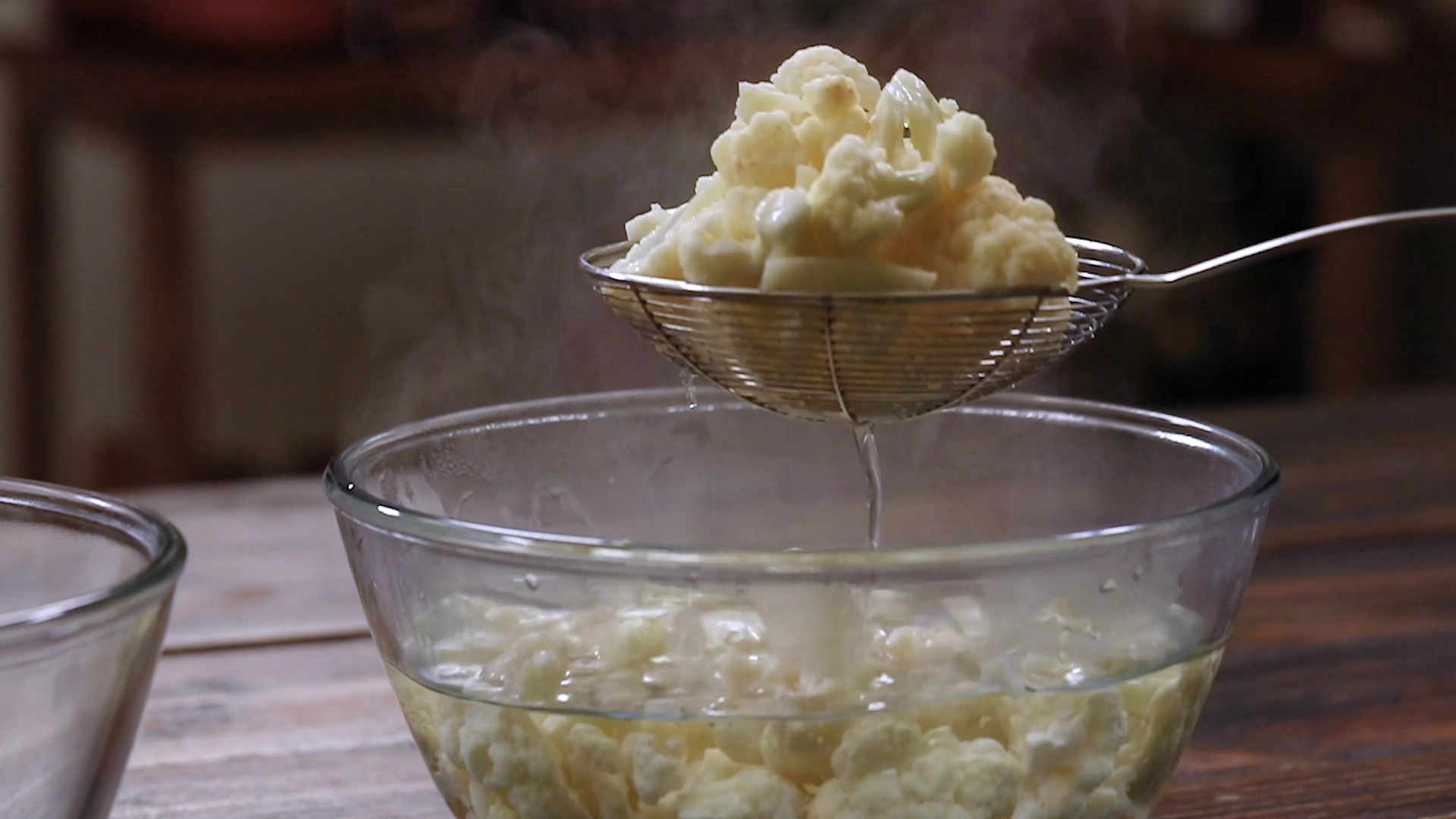 Turn off the stove, pour the hot water over the cauliflower florets and blanch for five minutes; strain and keep aside. -