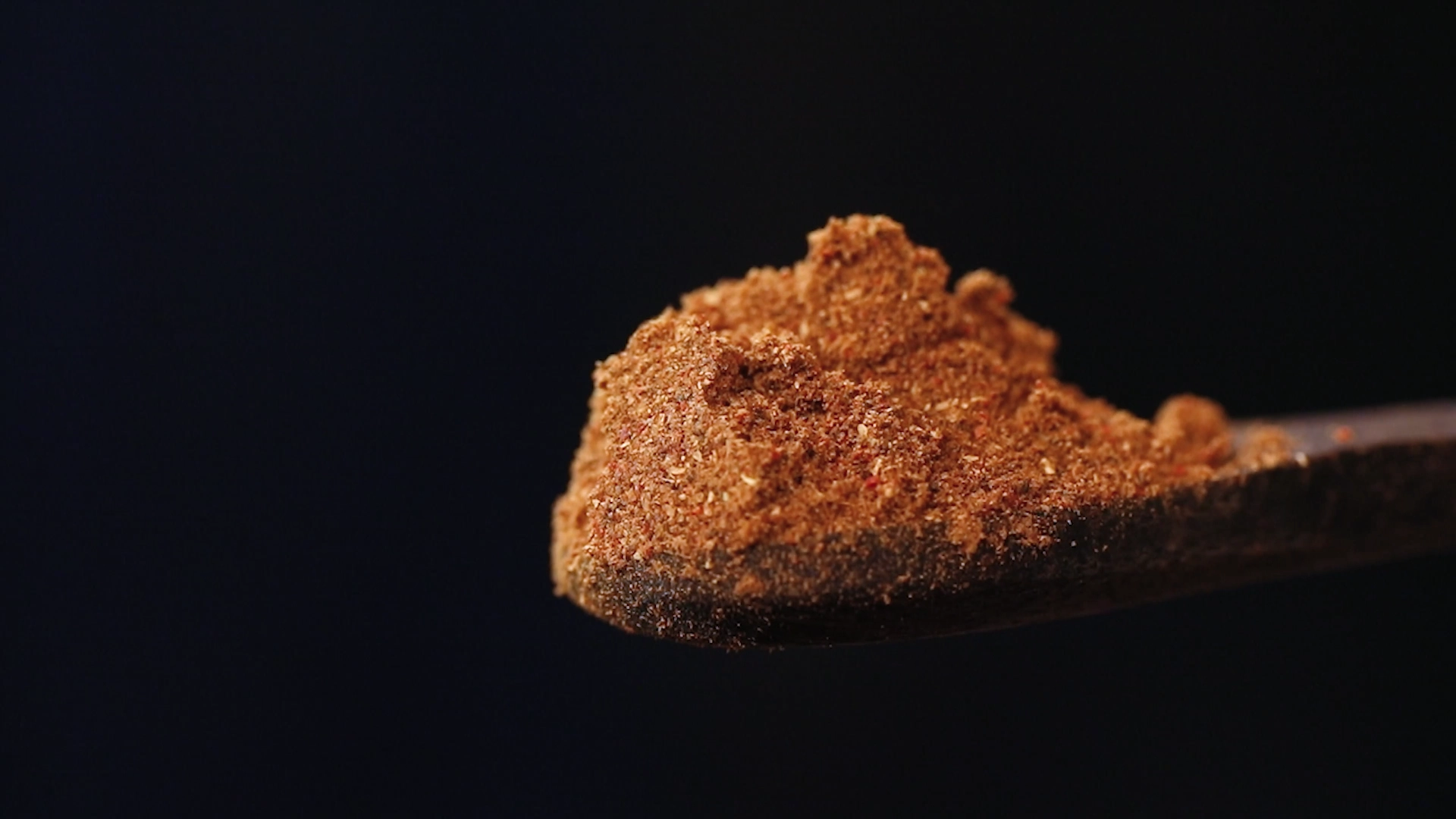 - Ground masala (coriander, peppercorns, cumin, fennel, red chilies, cinnamon, cardamom, cloves) — the star: toasted then ground for depth.