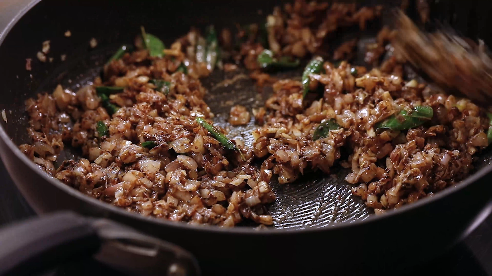 Heat oil in a wide pan and temper with mustard and cumin seeds. Add chopped onions, curry leaves, green chiles, and the pounded garlic-ginger — sauté until the onions turn a soft golden. Now sprinkle in the freshly ground masala and let it bloom for a minute on very low heat so the spices release oil and flavor without burning.