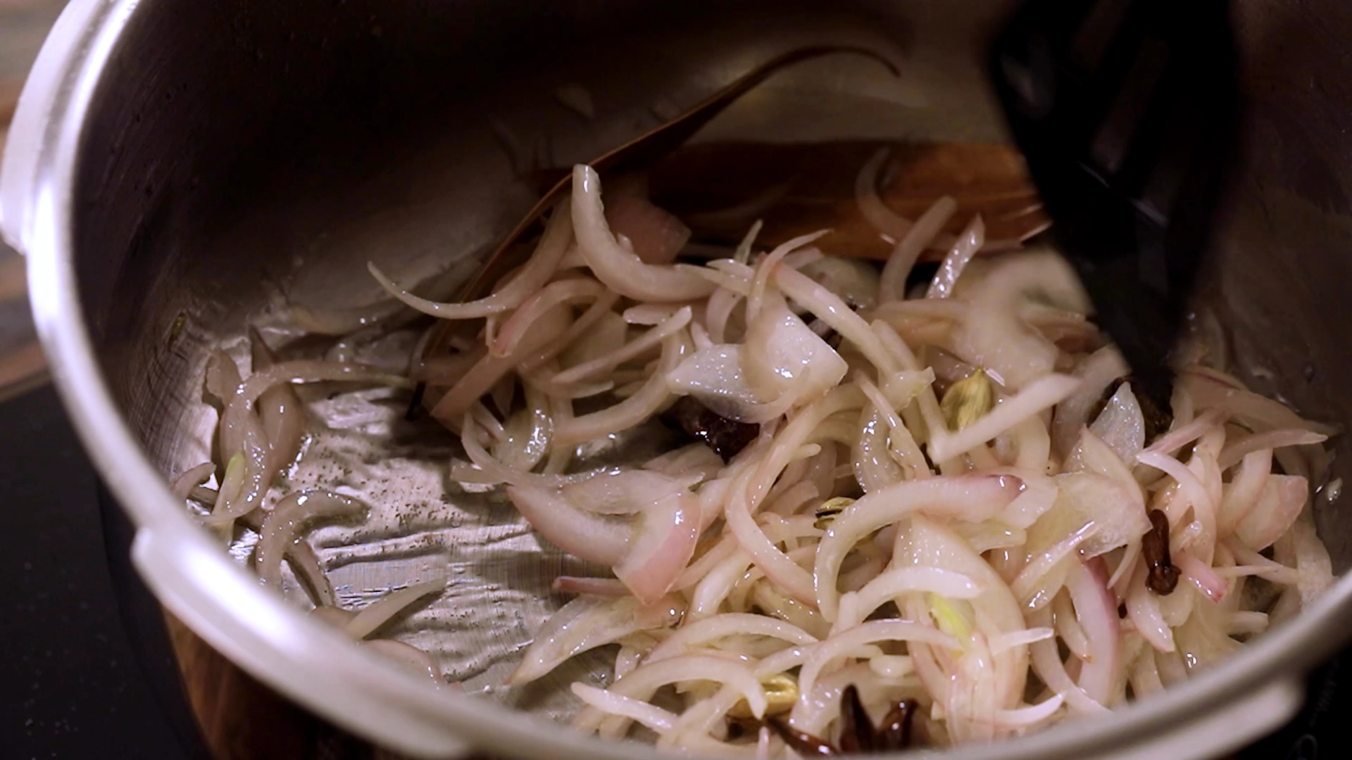 Next comes the base. Heat oil and a little ghee in your cooker, then drop in the whole spices. You’ll know they’re ready when the bay leaf curls slightly and the cloves puff. That aroma? That’s your flavor foundation.