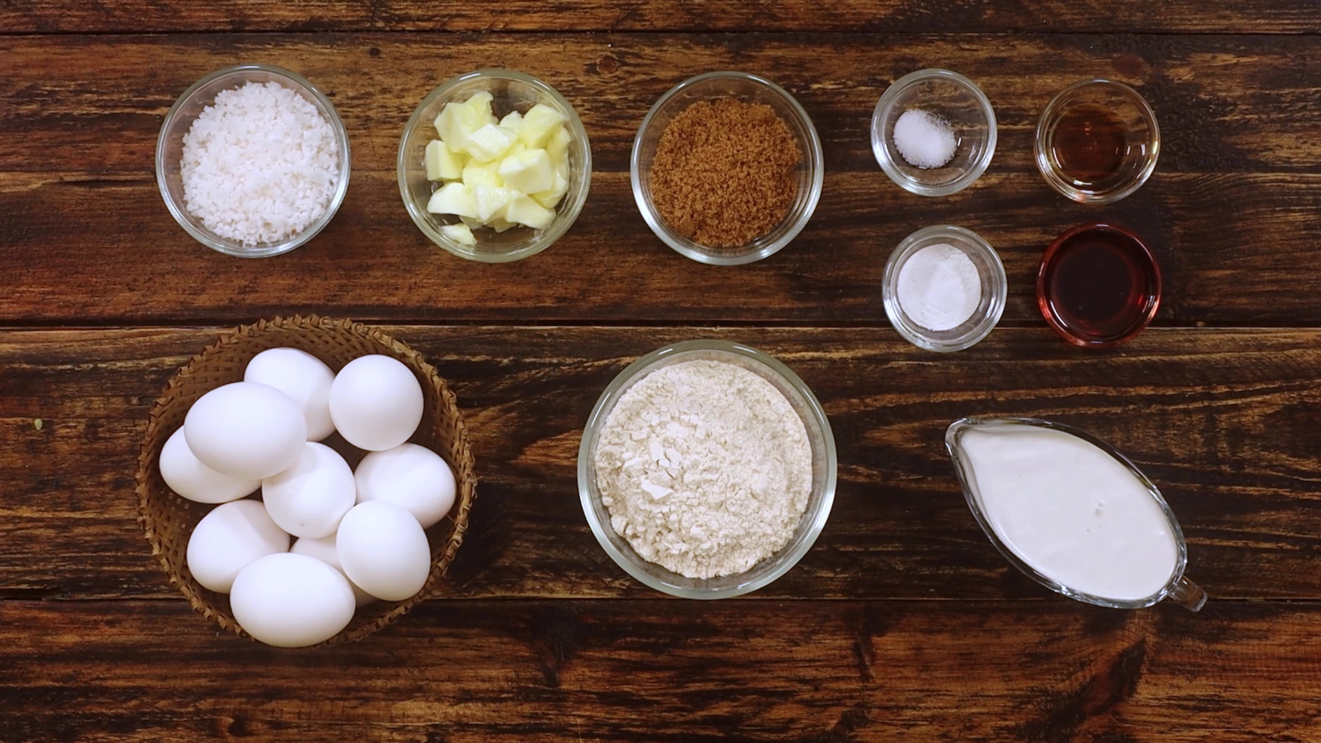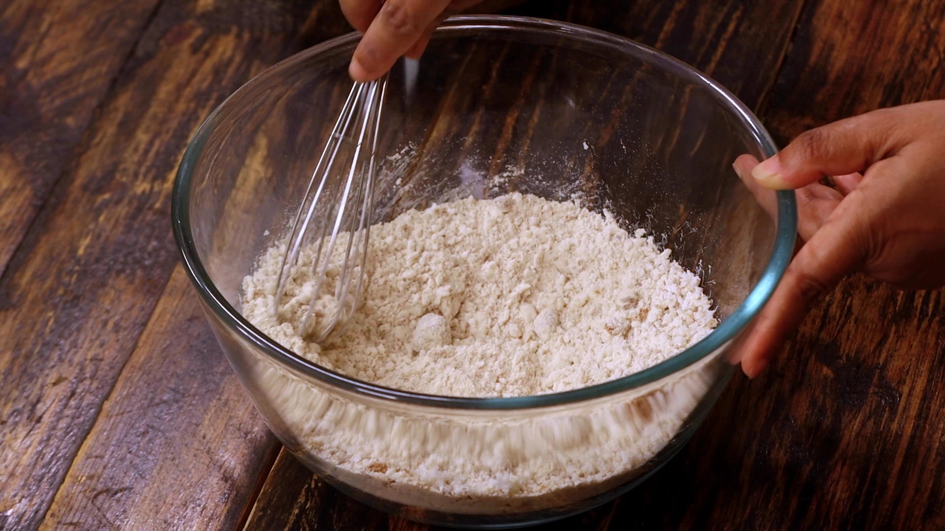 Start by mixing your dry ingredients — wheat flour, brown sugar, a pinch of salt, baking powder, and that freshly grated coconut. The coconut aroma itself feels like the vacation you deserve!