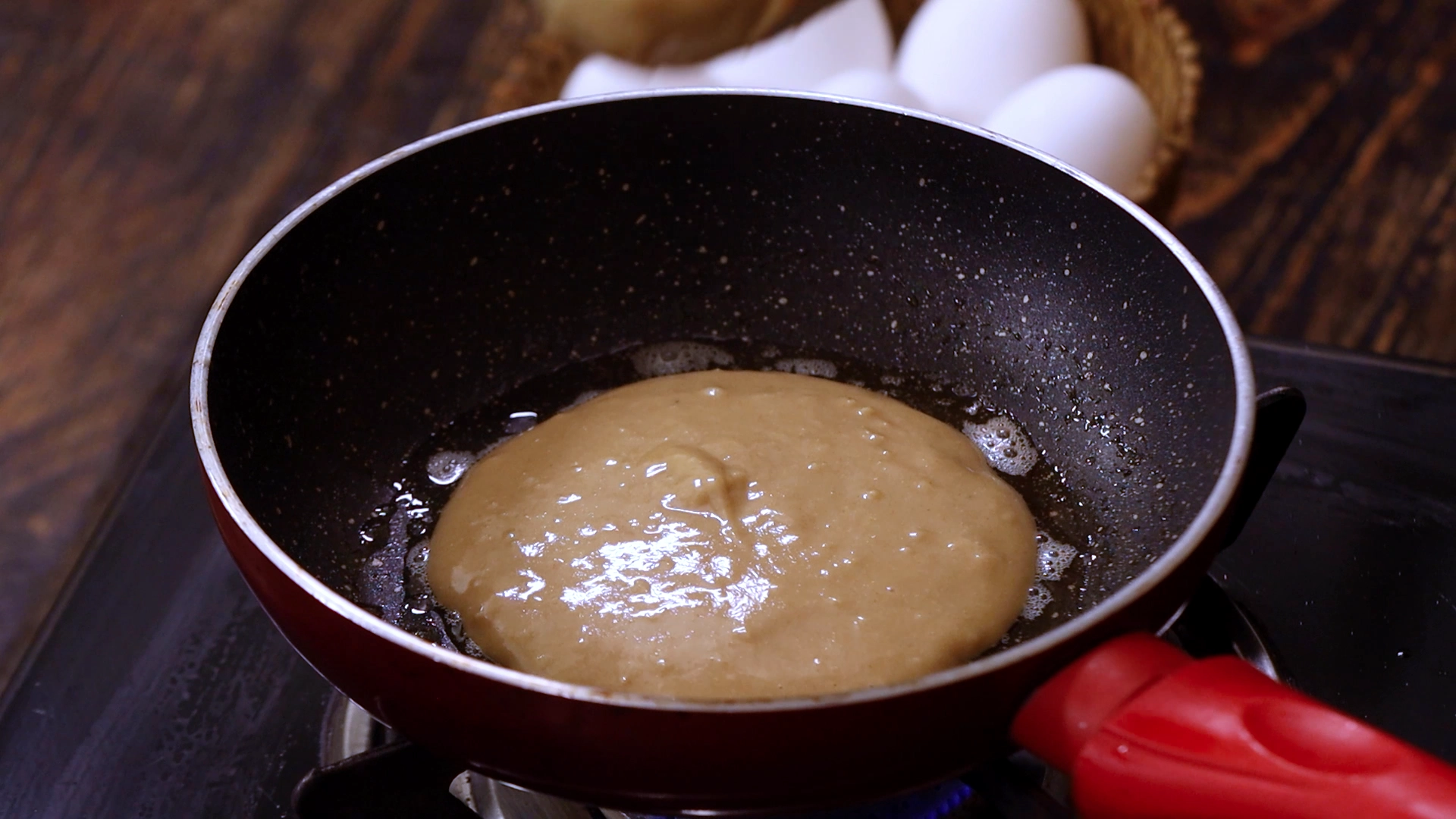 Now, heat your pan with a little butter. Pour a ladle of batter and don’t spread — pancakes love to puff up naturally.