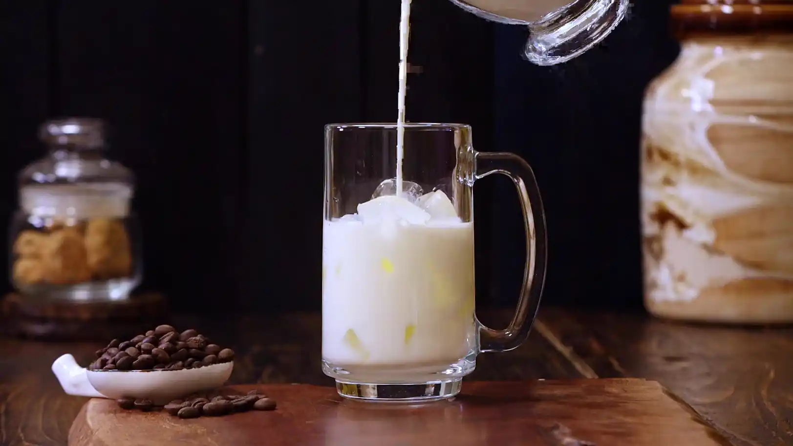 Pour cold milk over the ice cubes