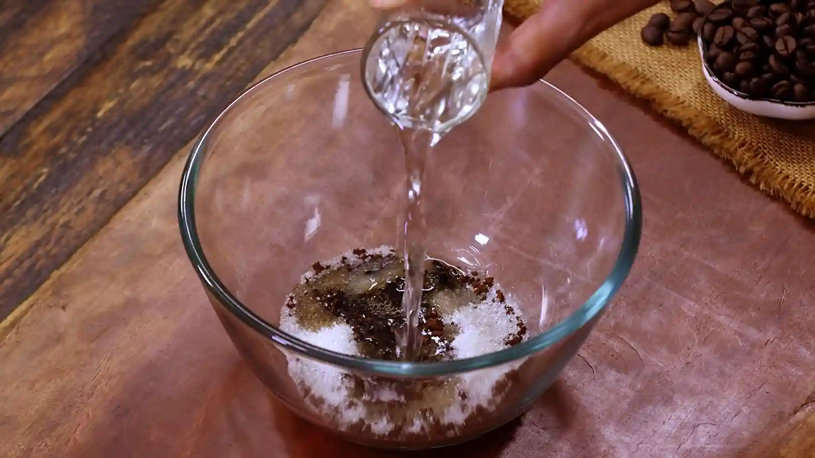 You start by mixing coffee and sugar with warm water, just enough to dissolve everything smoothly. Then comes the key moment.