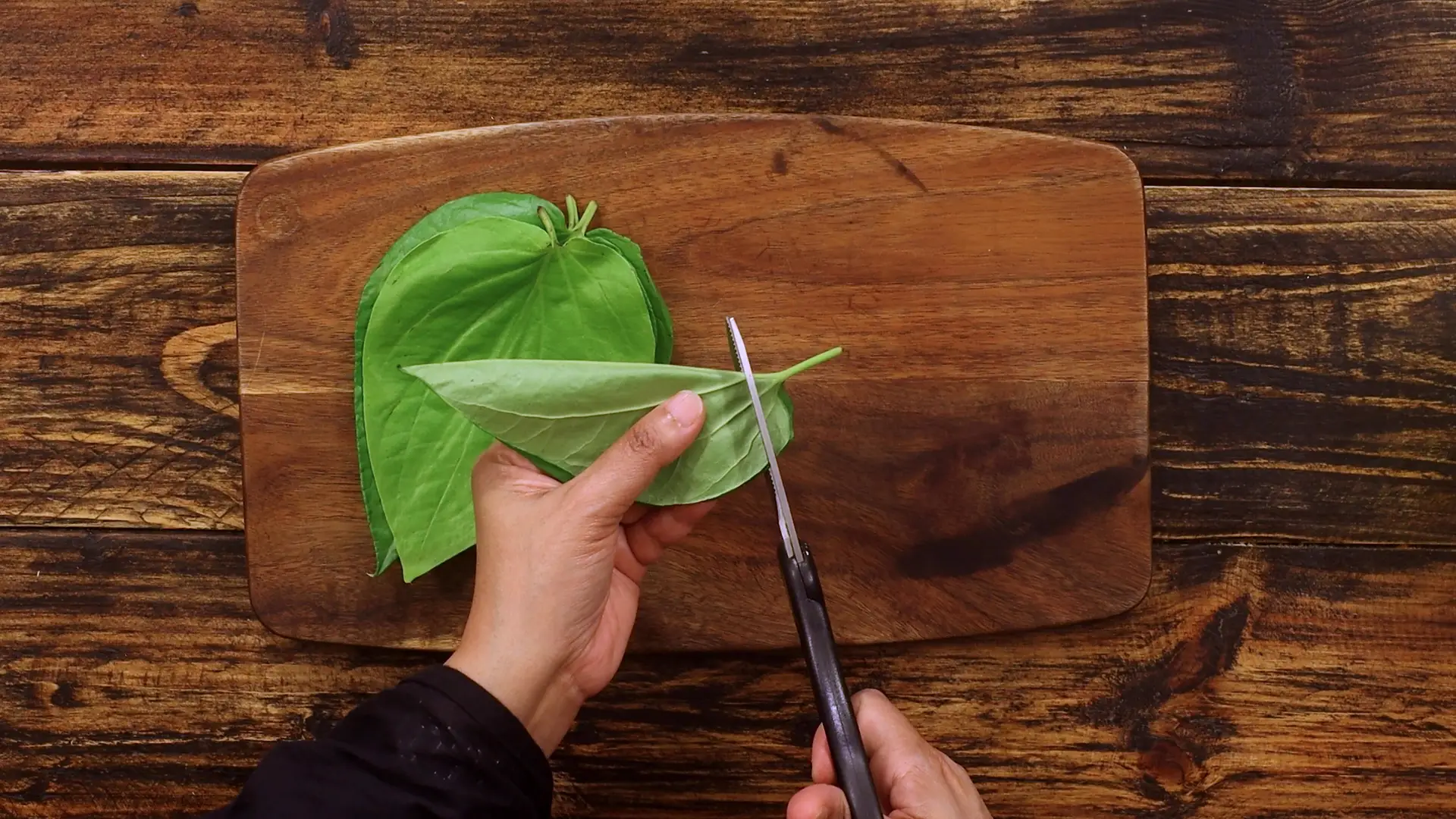 Gently cut off the thick stalk from each betel leaf. Use scissors to trim the stem neatly.