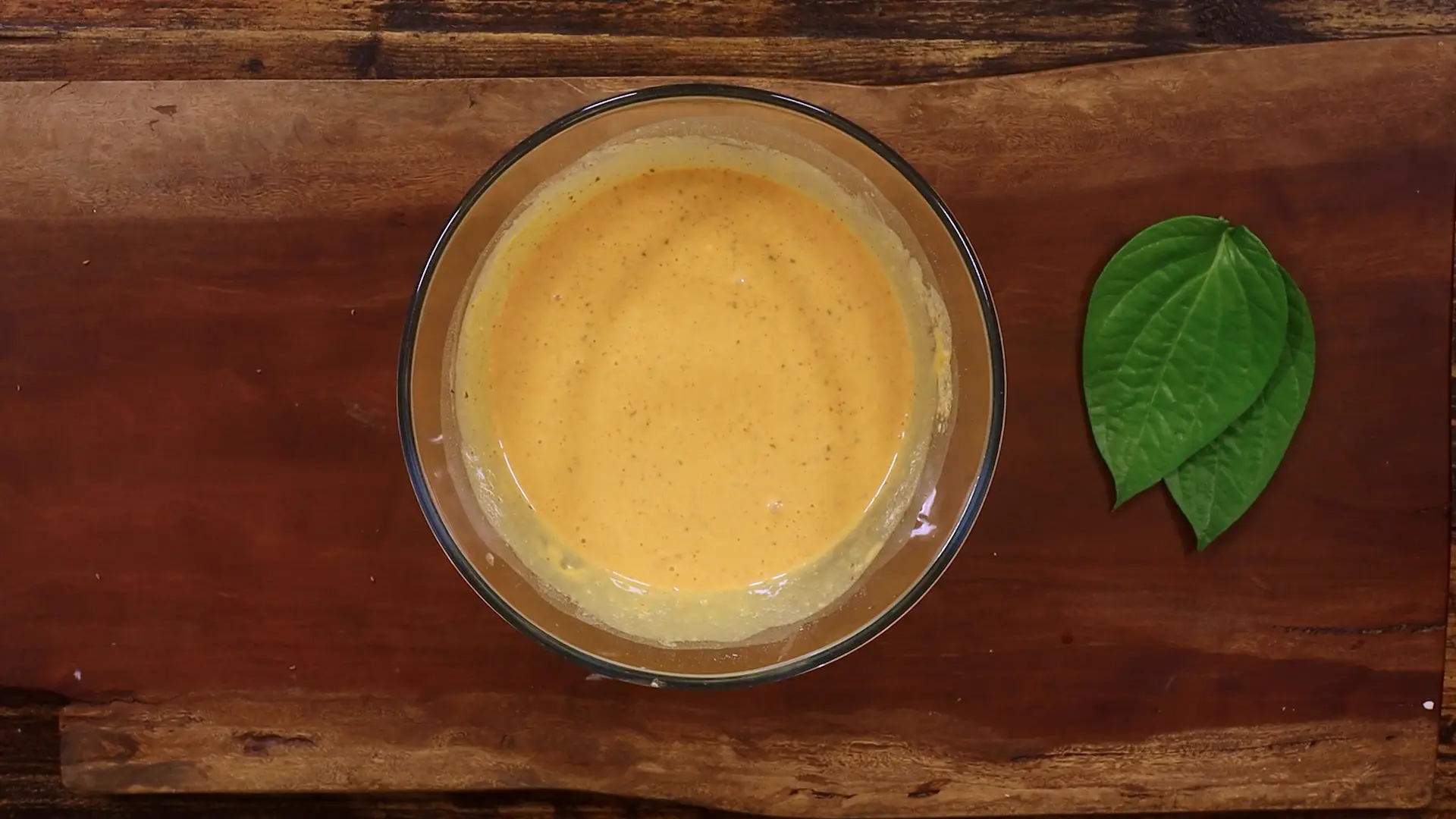 You’ll want all your leaves trimmed and ready first — remove the stem so they sit flat. Make a batter that’s medium-thick: thinking pancake-batter, not a heavy dough. This is crucial — too thin and the batter slides off; too thick and the bannji becomes doughy.