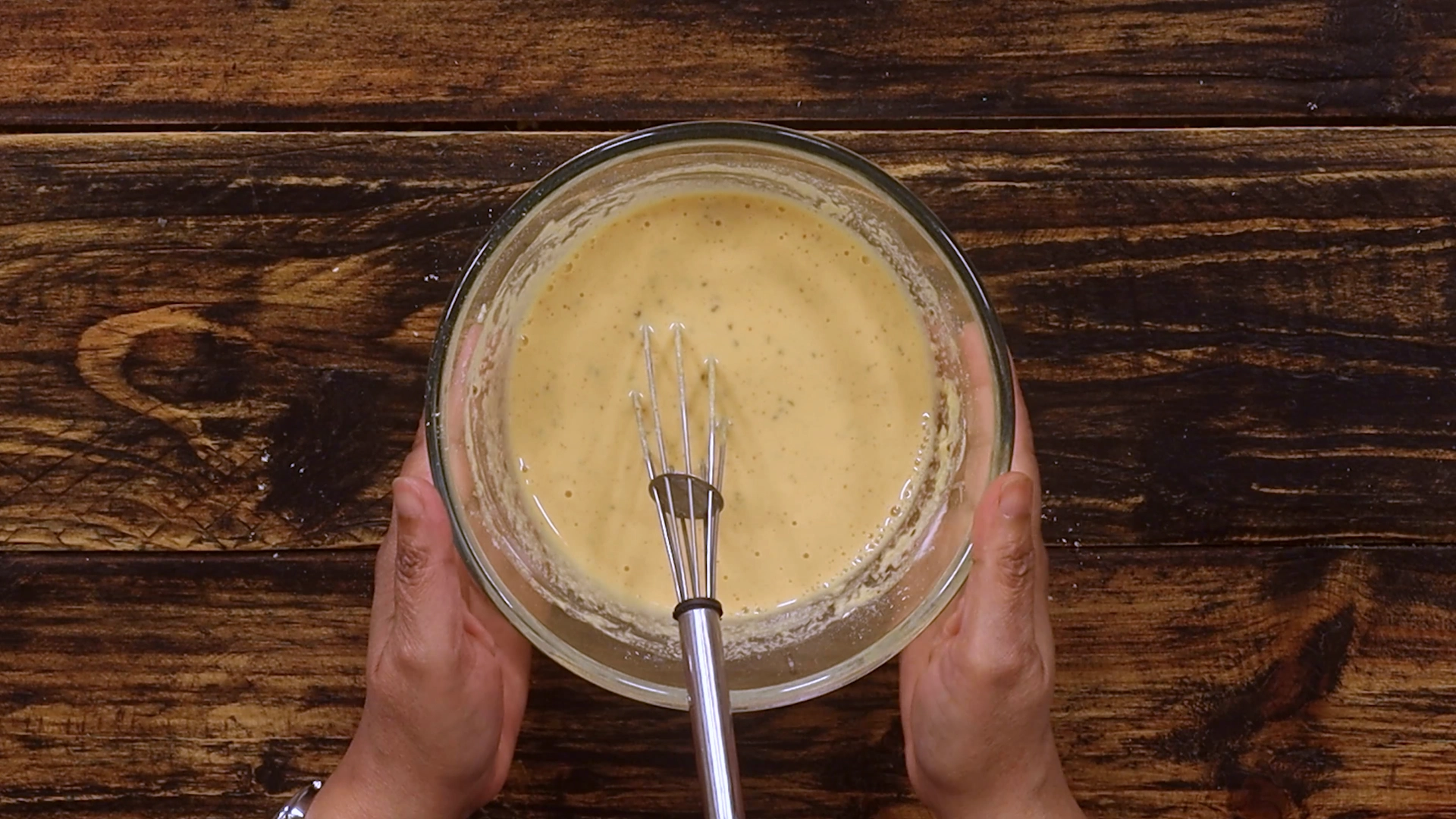 Whisk besan with salt, chilli and ajwain, adding water until the batter flows smoothly. -