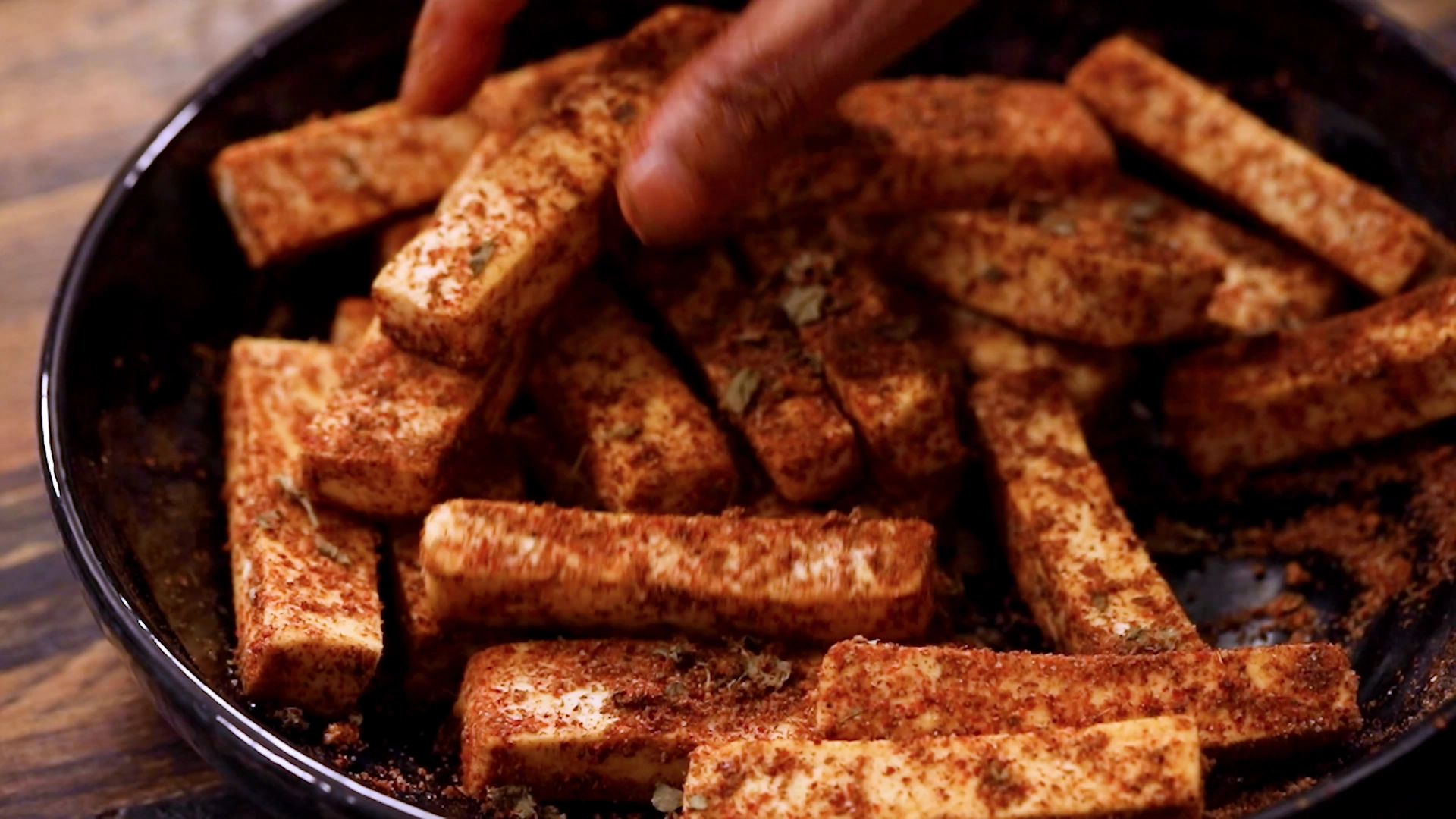 - Paneer: the star — high in protein, soft when cooked. Cut into fingers for even coating.