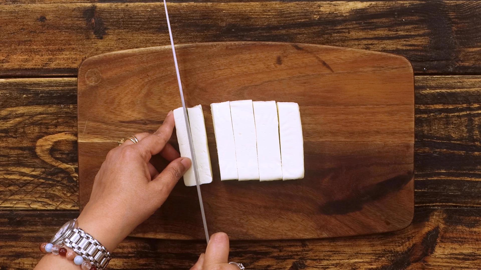 Cut the paneer into long finger-shaped pieces — not too thin, not too thick so they fry evenly.