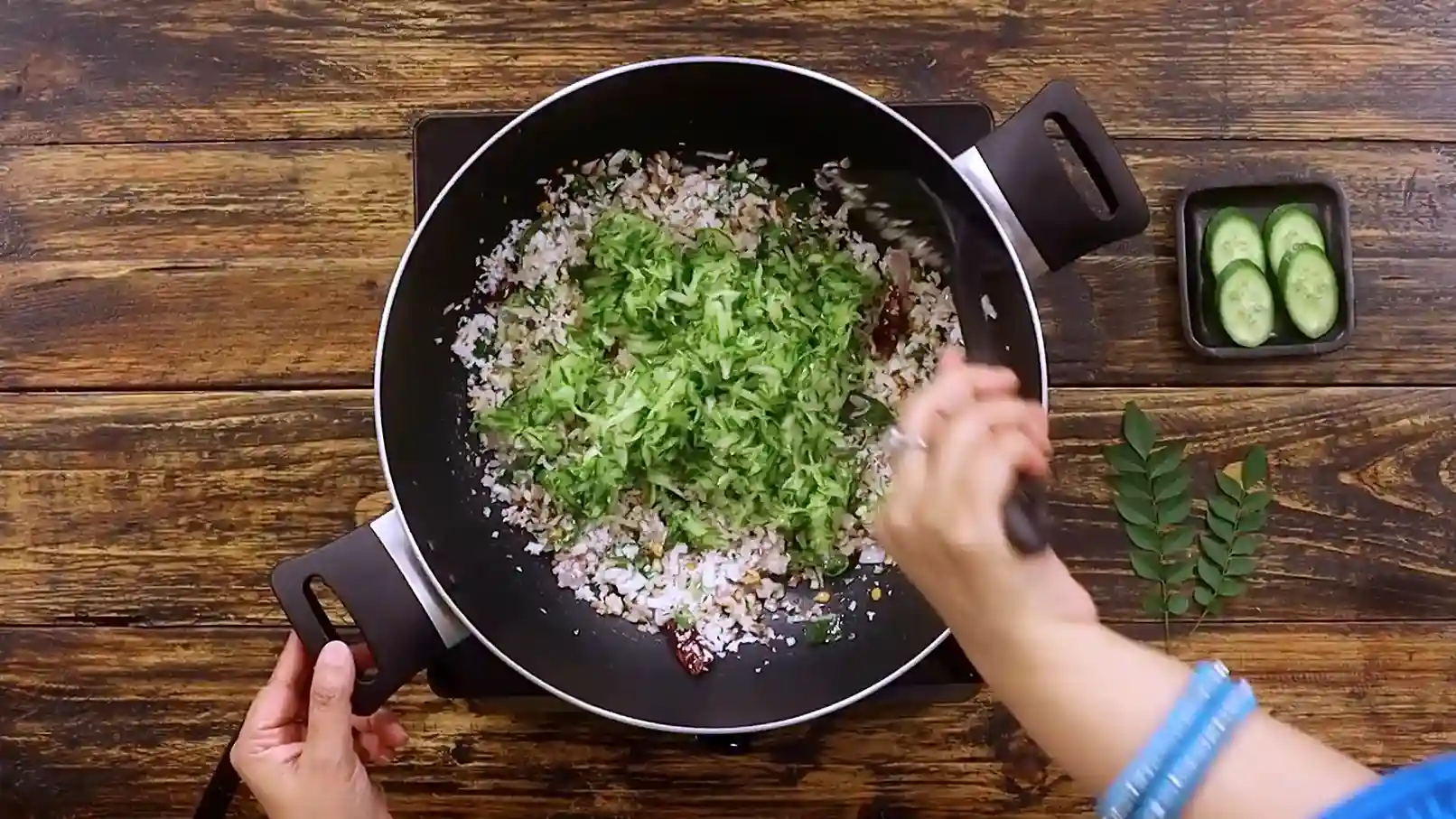 Now add finely chopped onions and cook until soft and translucent. Stir in salt and grated coconut, giving it a brief sauté so the flavors meld. Then add the squeezed cucumber and mix quickly, keeping the grains light and fluffy.