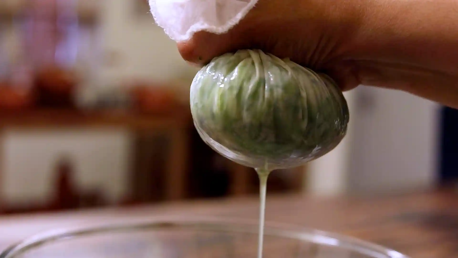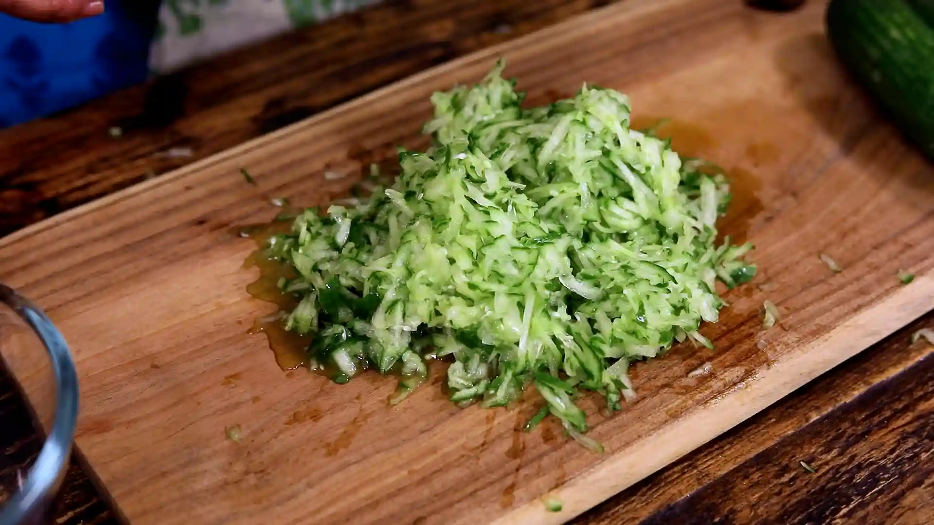 Place grated cucumber in a cloth-lined strainer and squeeze out excess water. -