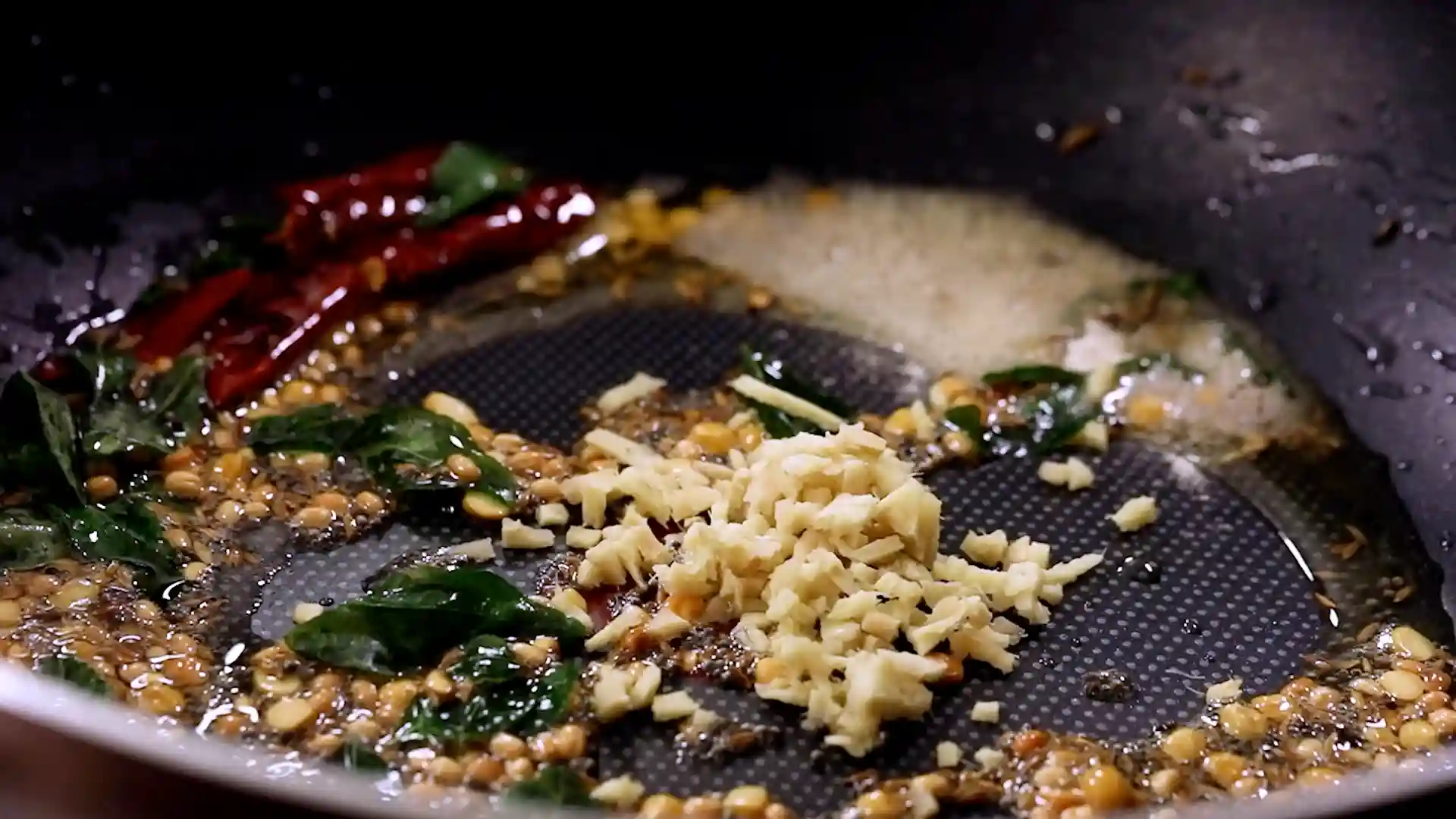 Next, heat oil and ghee in a wide kadai. Add chana dal, urad dal, and mustard seeds. Let the mustard seeds pop they release a nutty aroma that forms the base of the flavour. Toss in cumin seeds, dry red chillies,hing, curry leaves, green chillies, and ginger. Sauté until fragrant.