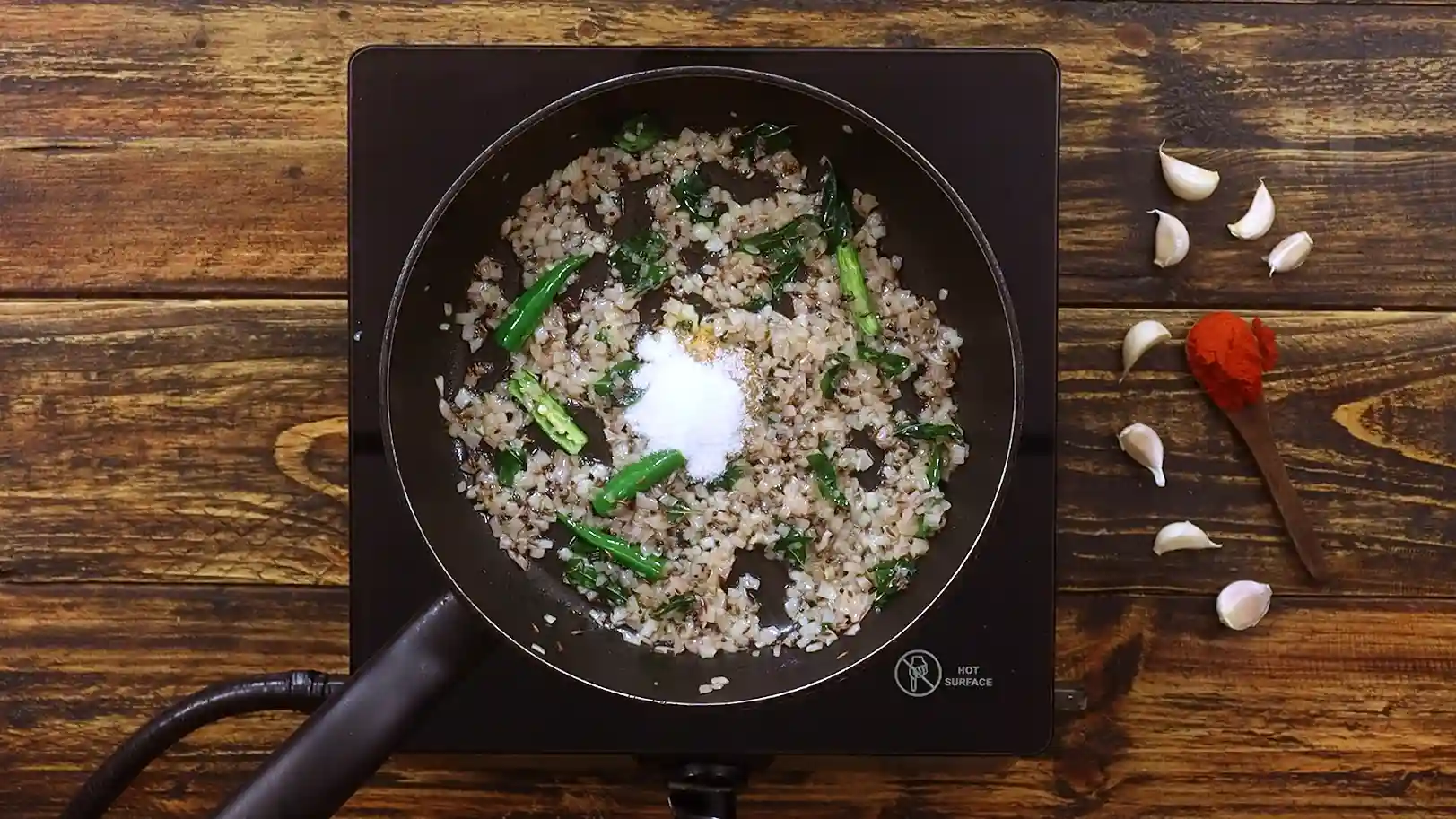 Hing and curry leaves go in quickly, followed by finely chopped onion and green chilli. This isn’t about browning, just softening everything so it blends smoothly.
