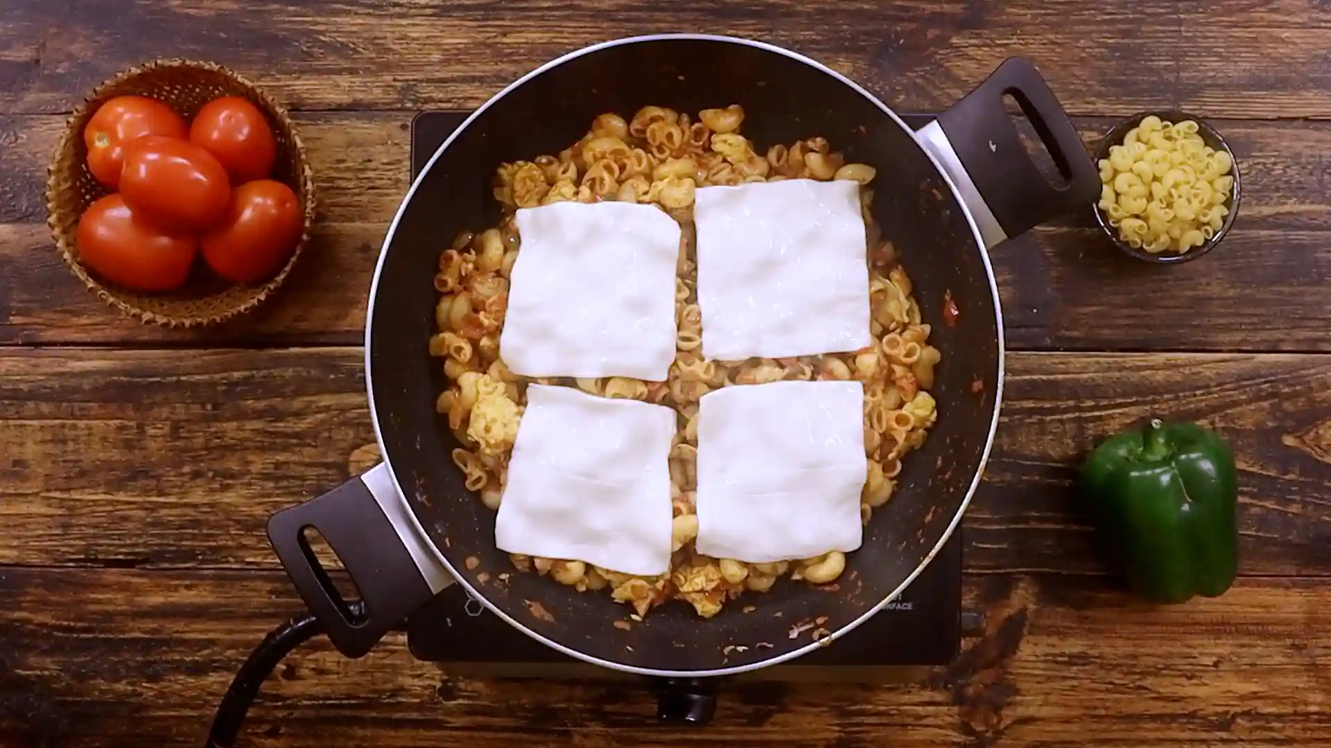Finally, place cheese slices on top, sprinkle chilli flakes, turn off the flame, cover the pan, and let the heat melt the cheese into the pasta.