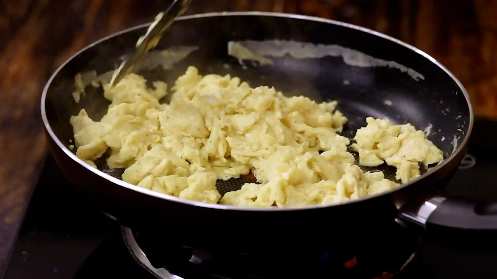 Soft scrambled eggs mixed into pasta create a rich, custardy texture without cream.