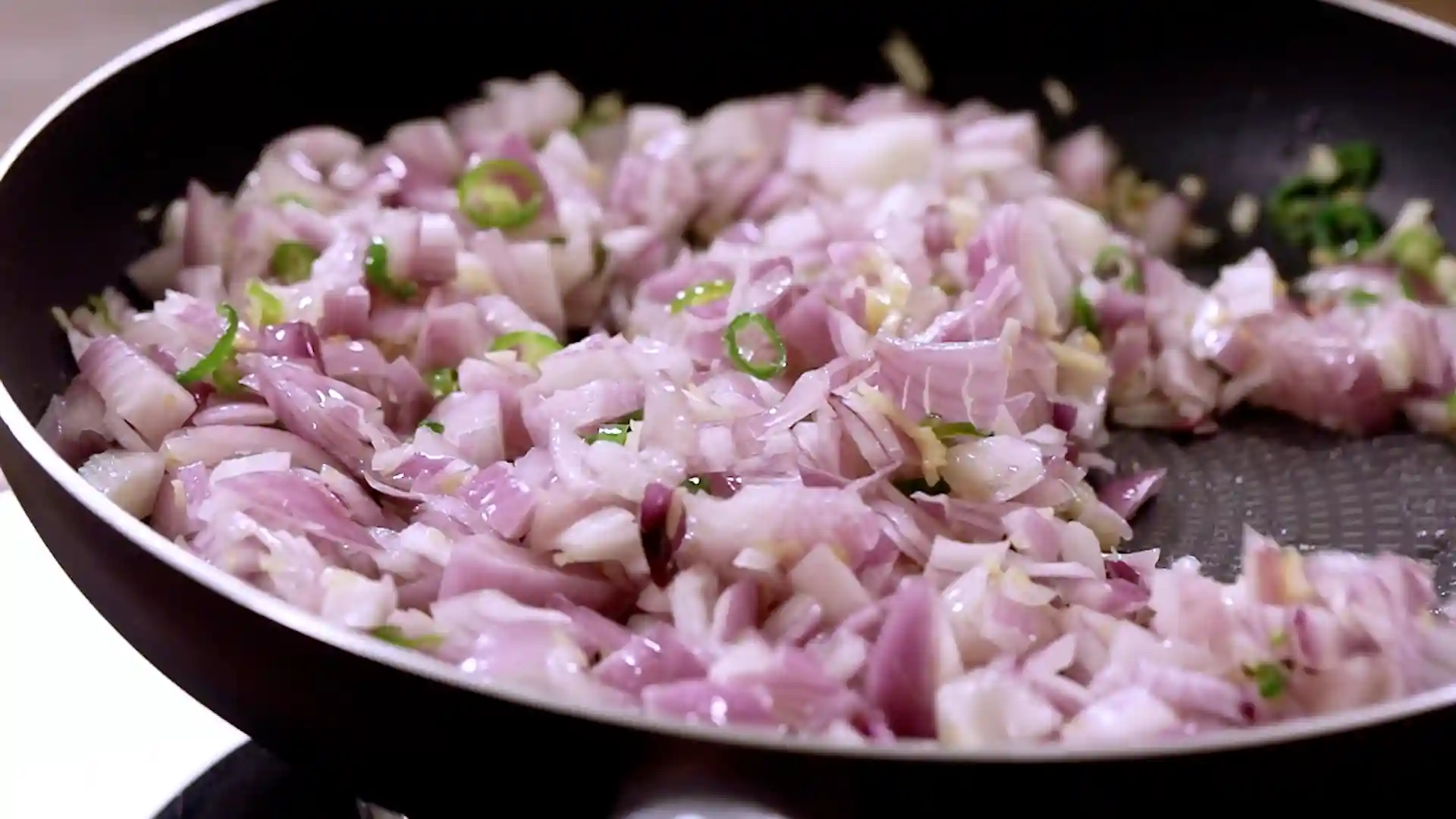 Start by heating oil in a wide pan. Once warm, add chopped garlic and green chillies. The aroma hits instantly; that’s your flavour base.