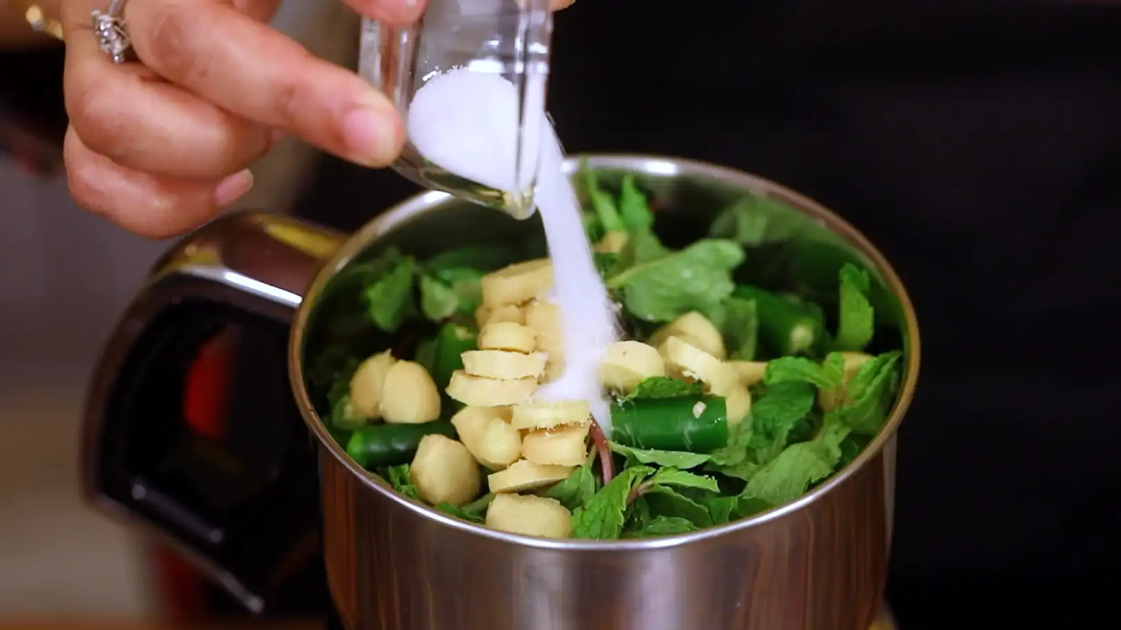 First comes the masala, mint, green chilli, ginger, and salt are ground without water to keep the flavor intense. Only a little water is added at the end to bring it together into a smooth, fragrant paste.