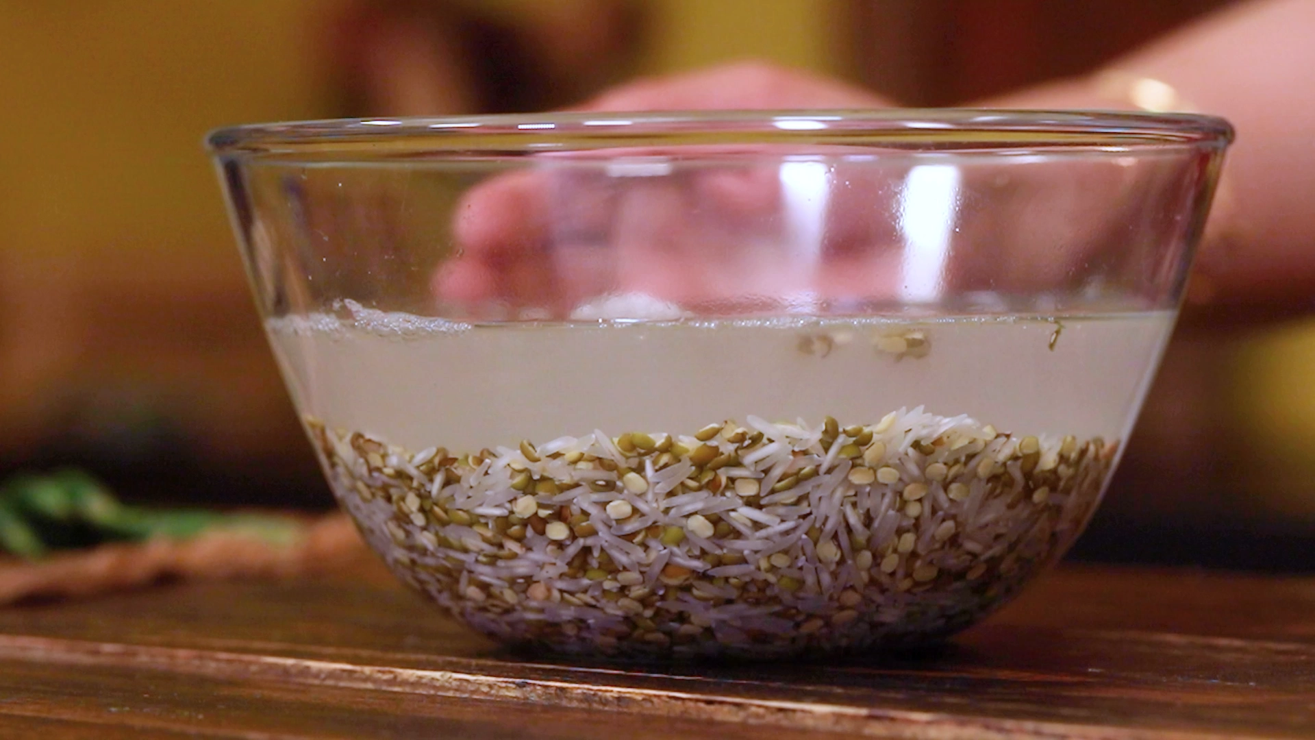 Wash green moong dal and rice 2 to 3 times and soak them for one hour.