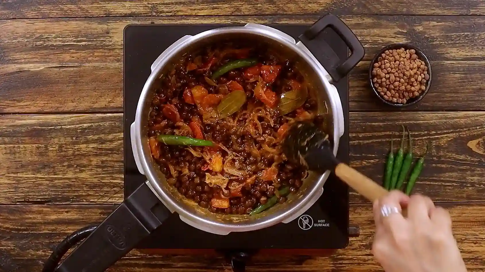 Everything is mixed gently, salt is adjusted, and the cooker is closed. Just a short pressure cook later, you open the lid to perfectly fluffy rice with evenly spread chana and spices.
