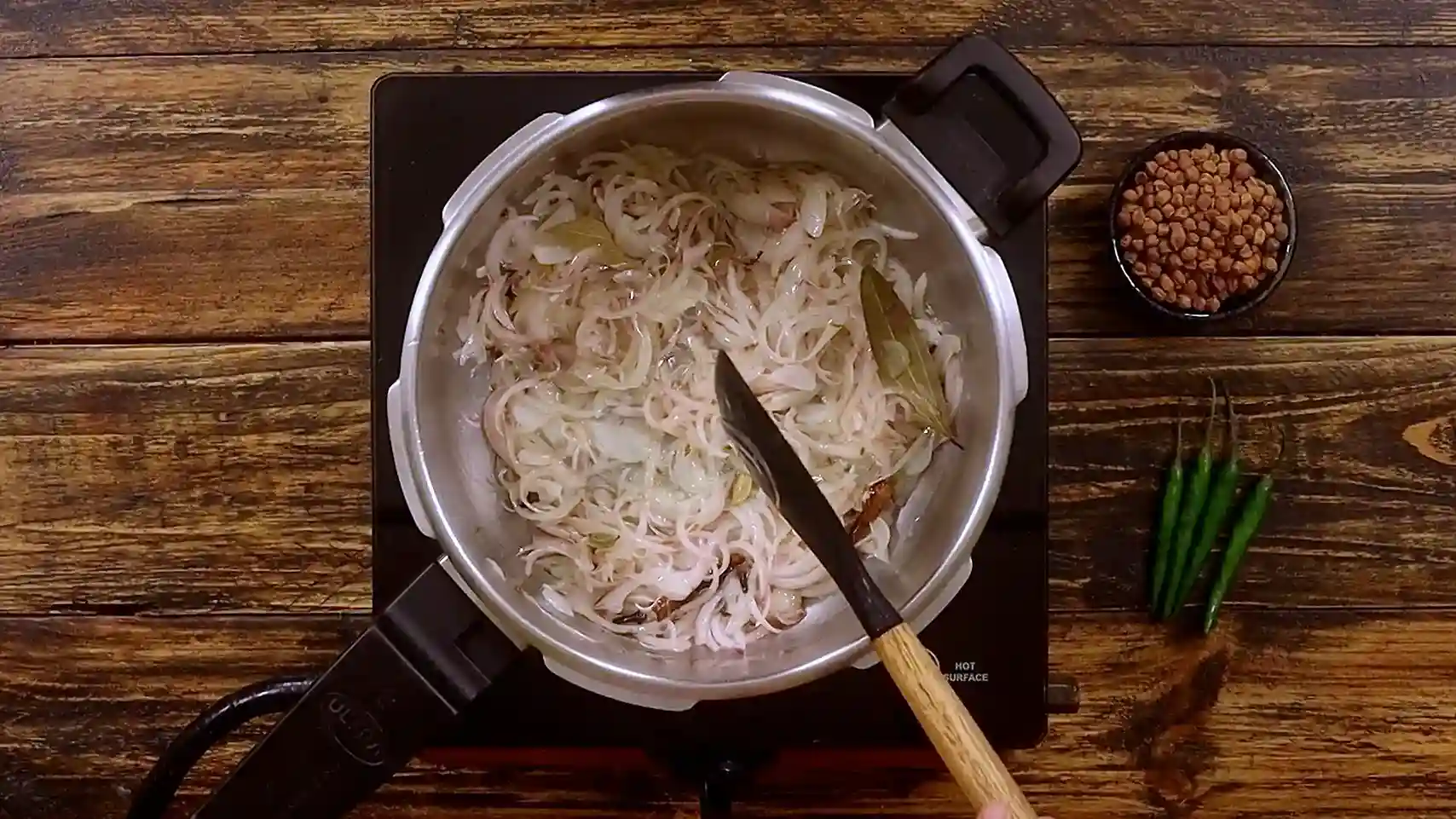 In the same cooker, oil and ghee go in first, followed by whole spices. Once they release that warm, bakery-like aroma, sliced onions are added and cooked till soft and lightly golden. Ginger-garlic paste and green chillies go next, waking up the entire base.