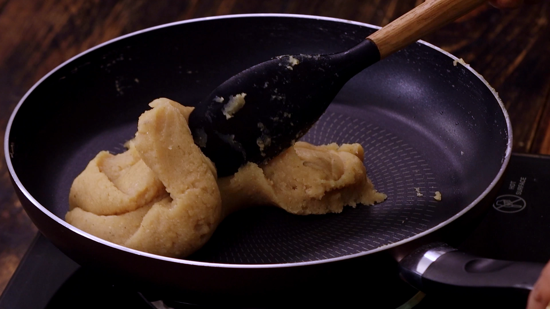 Add ghee little by little and continue cooking until the mixture comes together into a thick, binding mass -