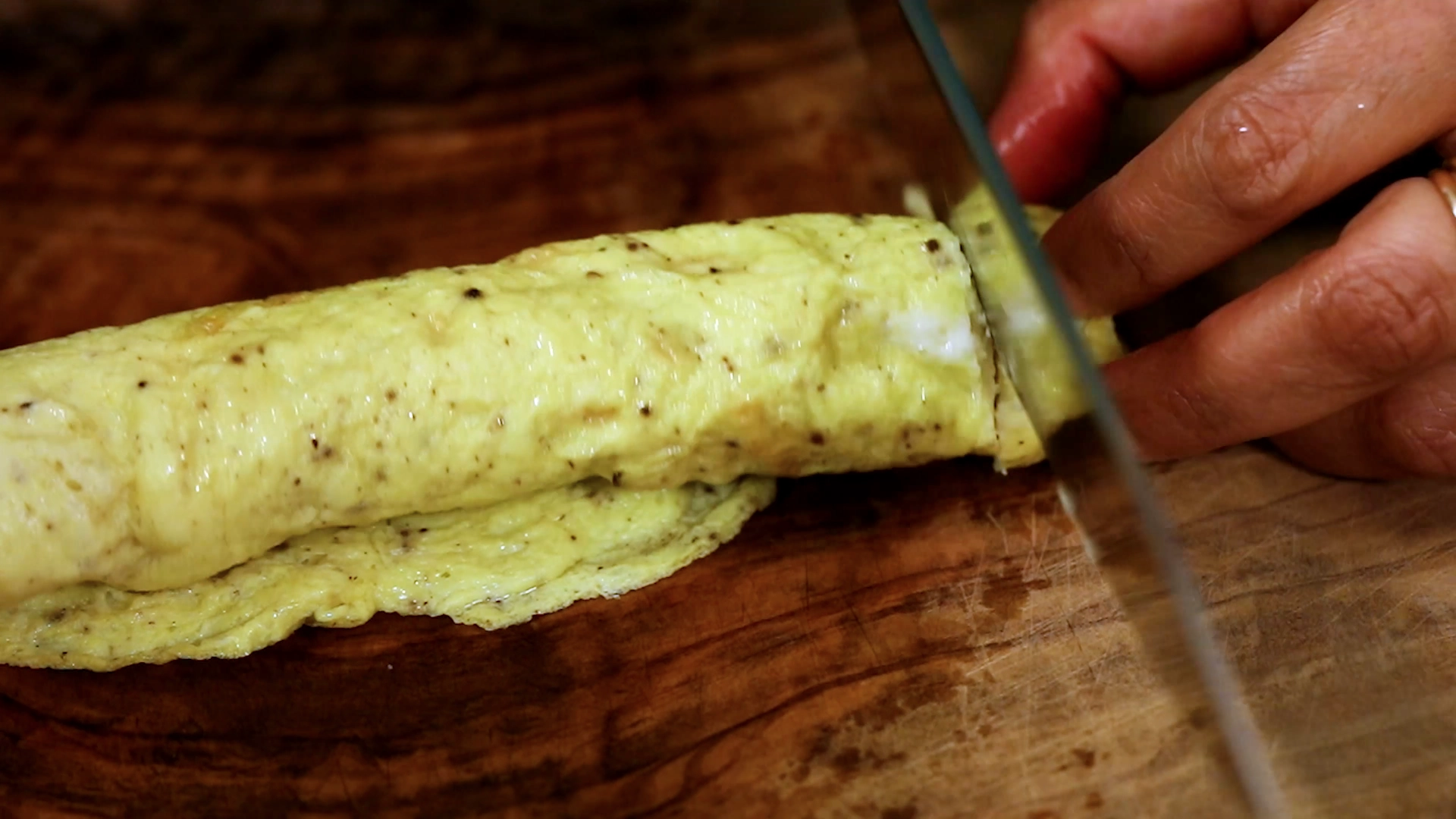 Heat a pan with a little oil and pour the egg mixture in to make an omelette.