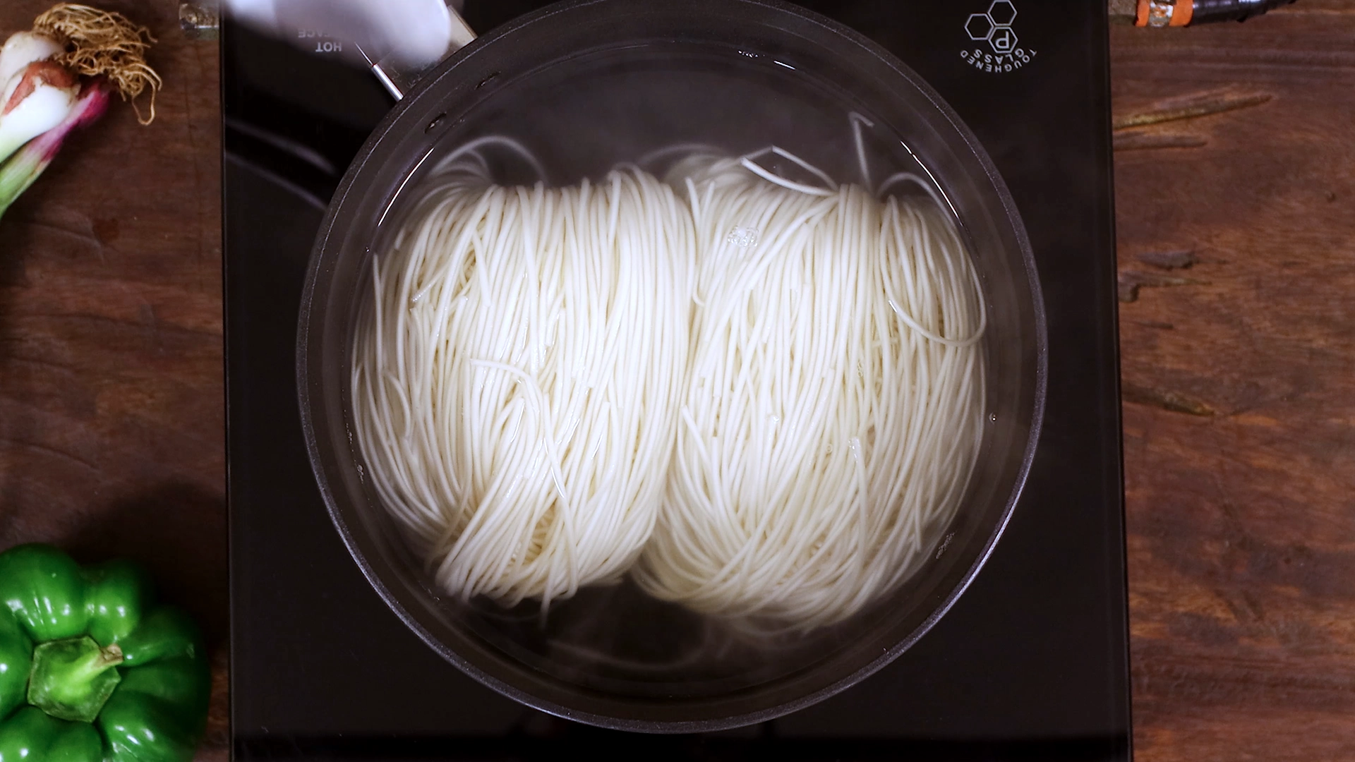 Picture yourself at the stove: start with a pot of boiling salted water and cook the noodles just until tender — slightly underdone so they finish in the wok. Rinse under cool water to stop cooking and keep them from turning mushy.