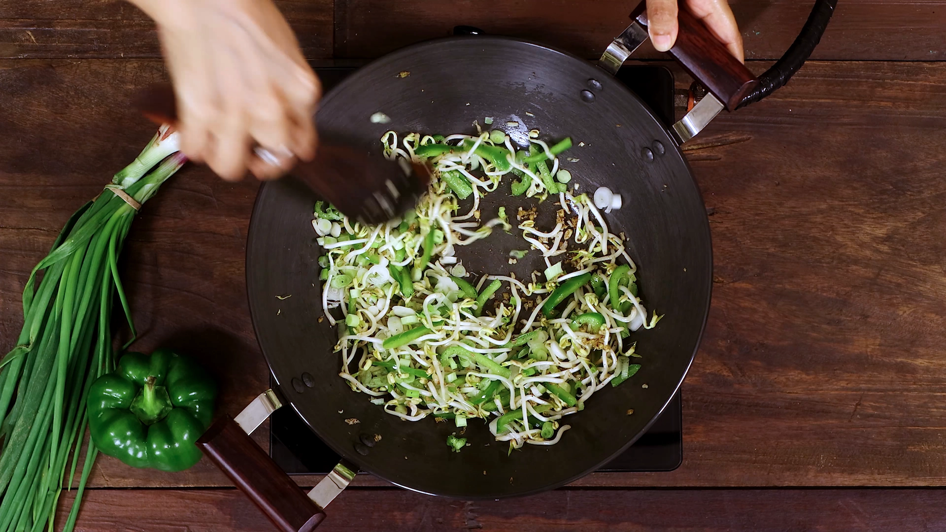 Next, whisk eggs and make a thin omelette in a hot pan — quick, golden, and folded into a log; later, you’ll chop it into ribbons. In your wok, heat a little sesame oil, add minced ginger and garlic, then toss in the bean sprouts and diced capsicum. Let them sizzle — you want a little char but still crunchy.