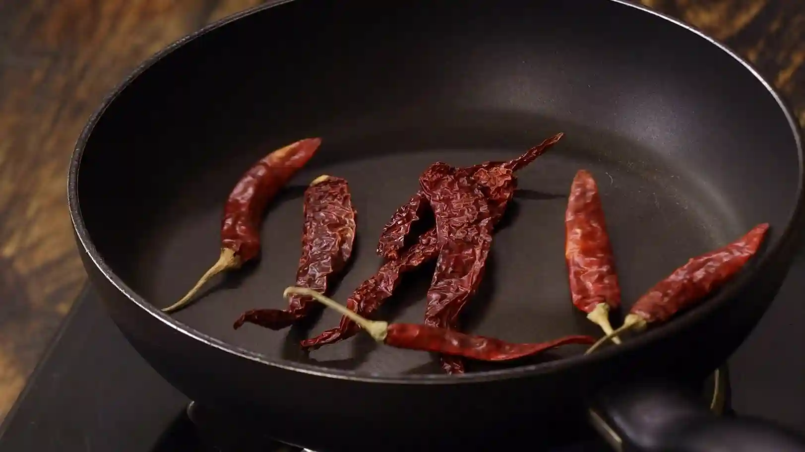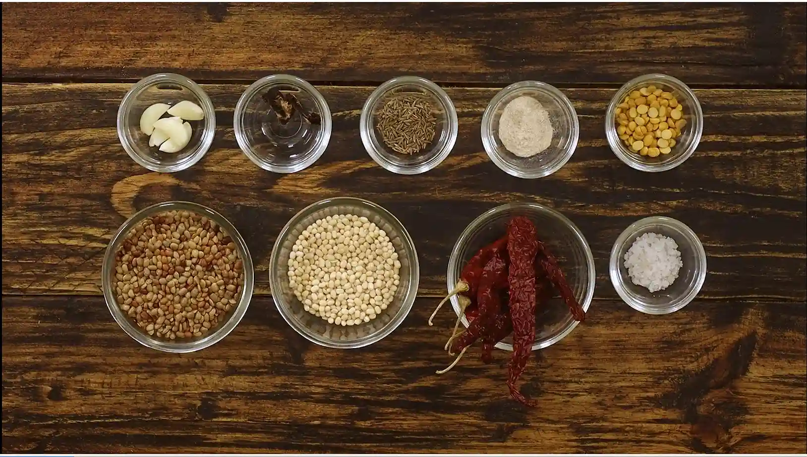 Horse gram is roasted patiently until it turns deep brown and releases a nutty aroma. Dals follow, roasted just until golden. Chillies are crisped gently, not burned, so the heat stays clean. Garlic, cumin, and tamarind are lightly toasted to round out the flavor.