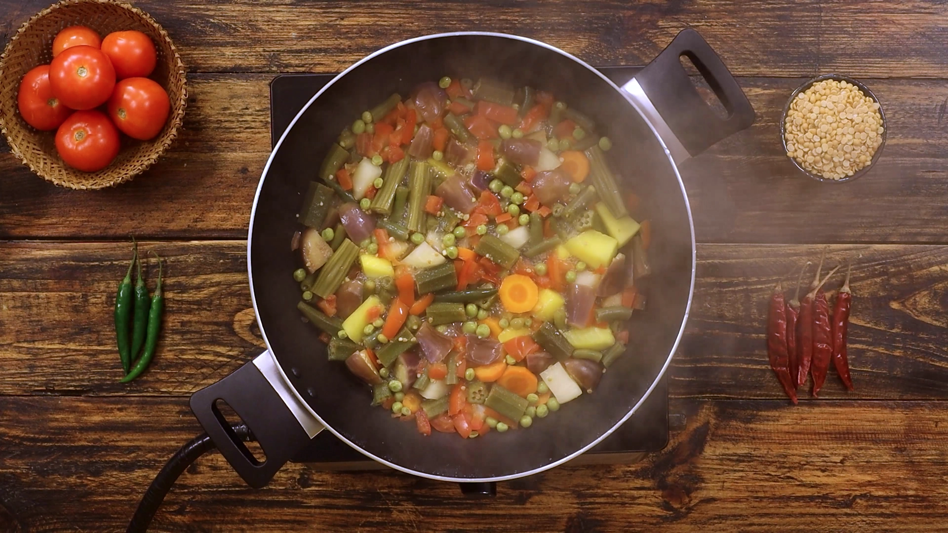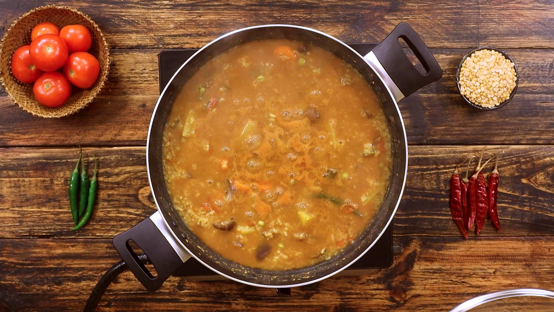 - Complete meal in one pot: rice + toor dal for body and protein, a huge variety of vegetables for micronutrients, and roasted masala for depth.