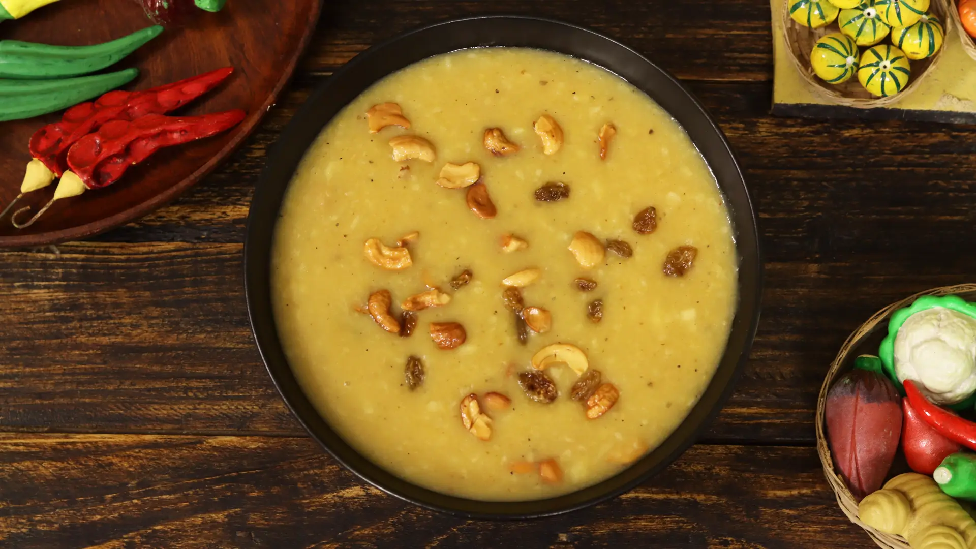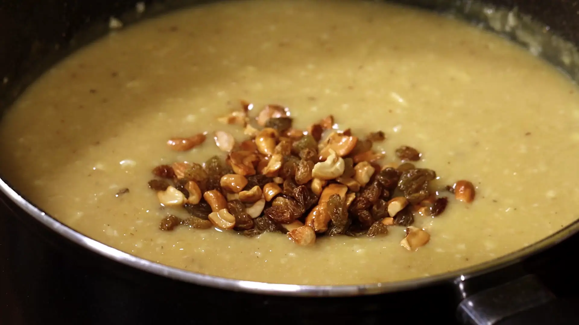 Taste profile: nutty dal, warm cardamom, caramel notes from jaggery, crunchy roasted cashews and pops of raisins.