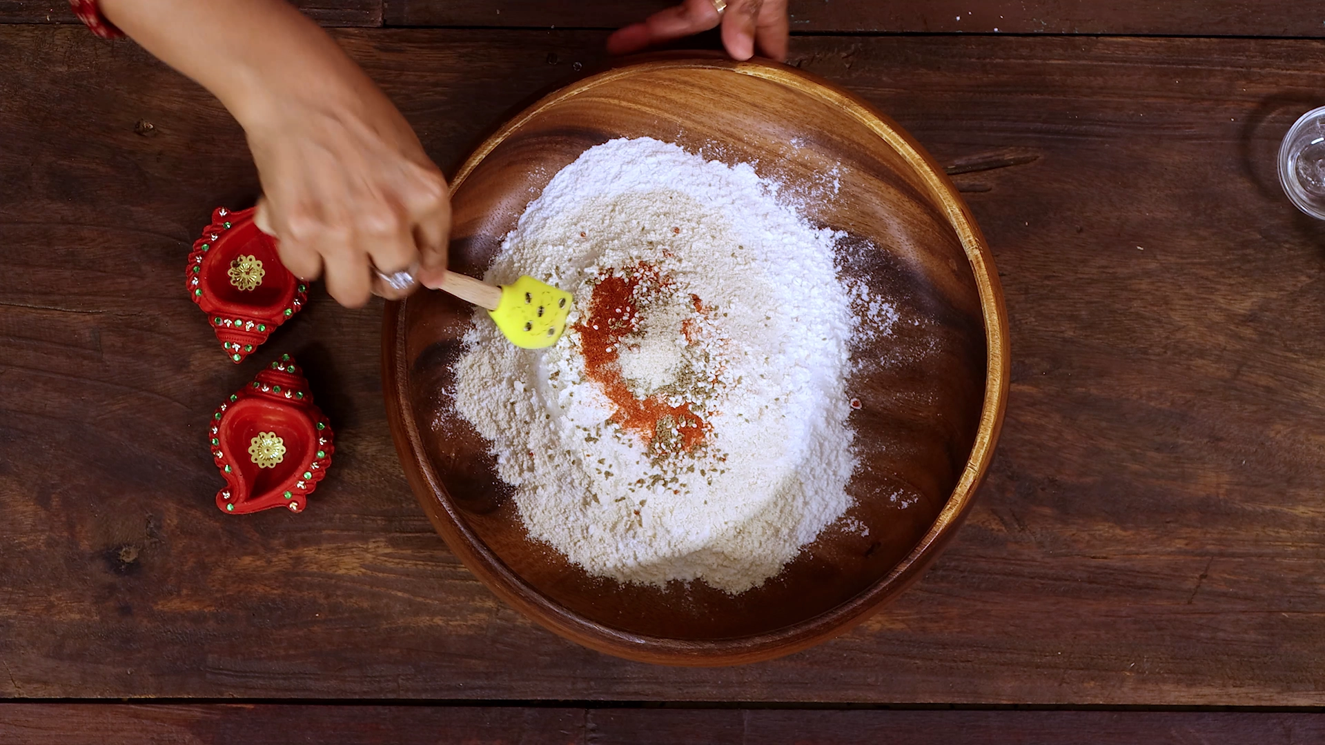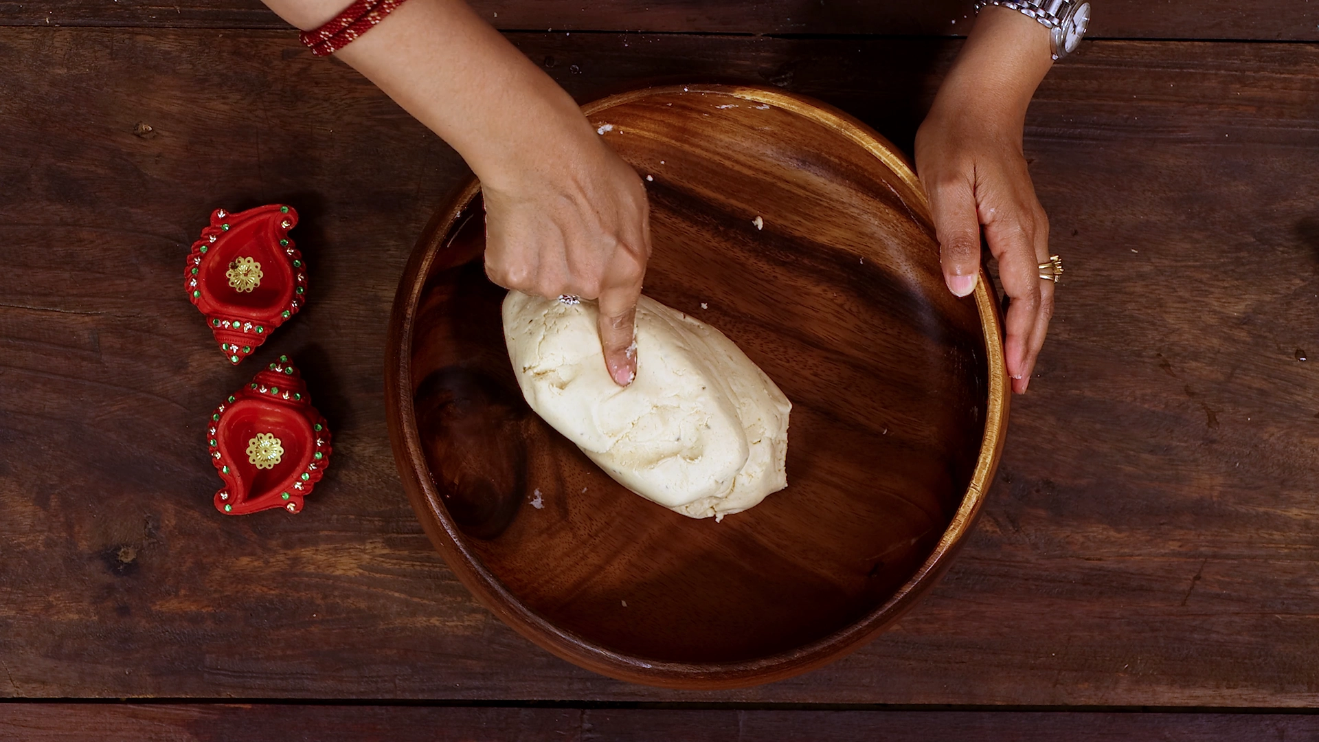 Add the melted ghee to the dry mix and gradually add water little by little, kneading to form a soft, moist dough. Do not let the dough sit for long once ready.
