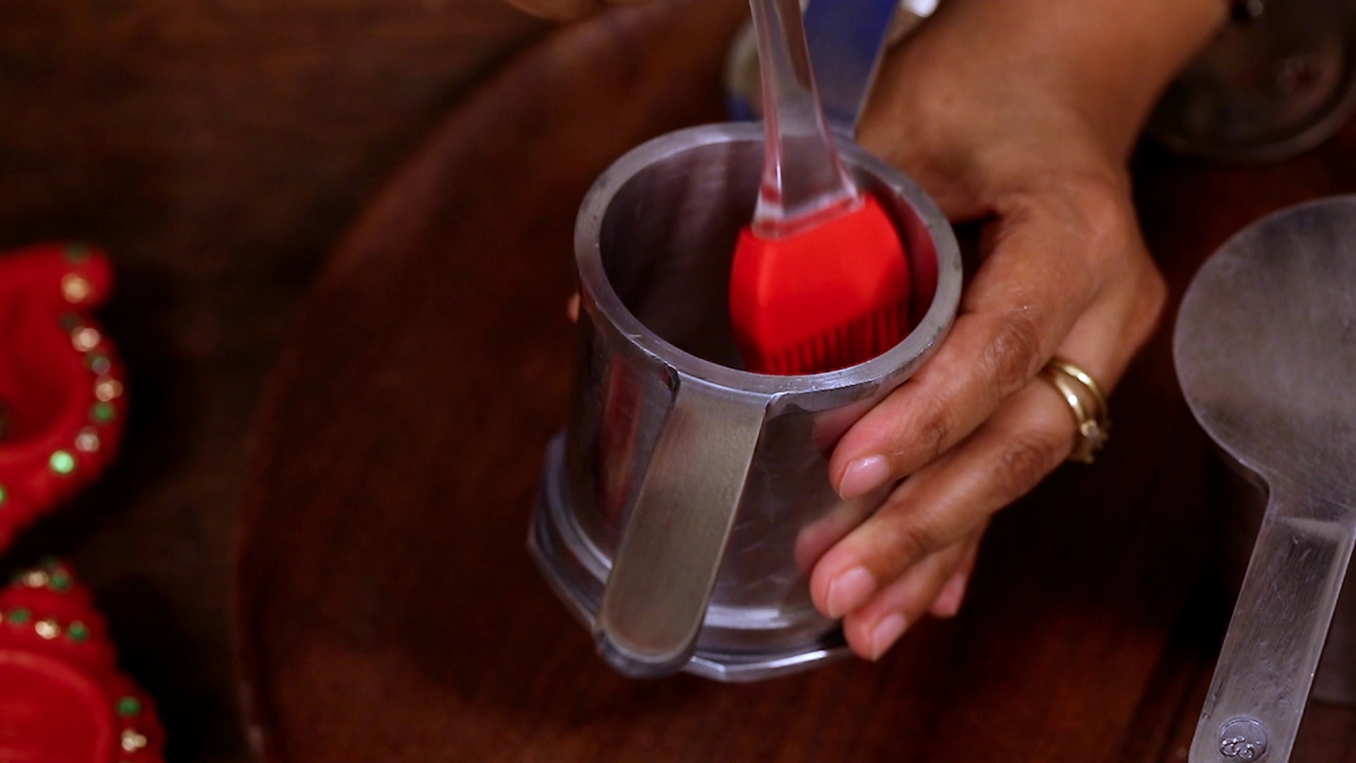 Grease the inside of the murukku press and fit the plate with your chosen pattern. Grease the back of a spatula. -