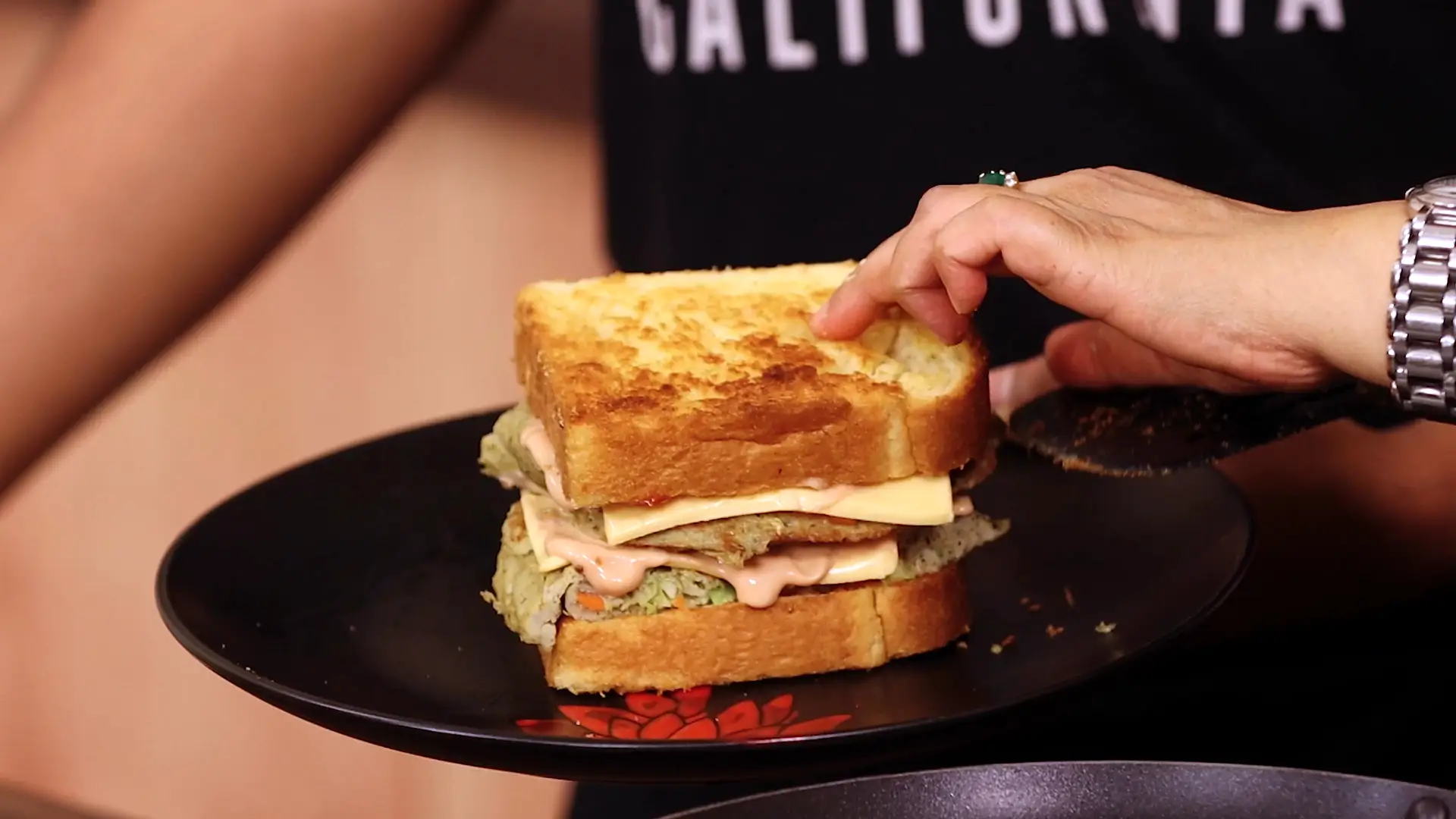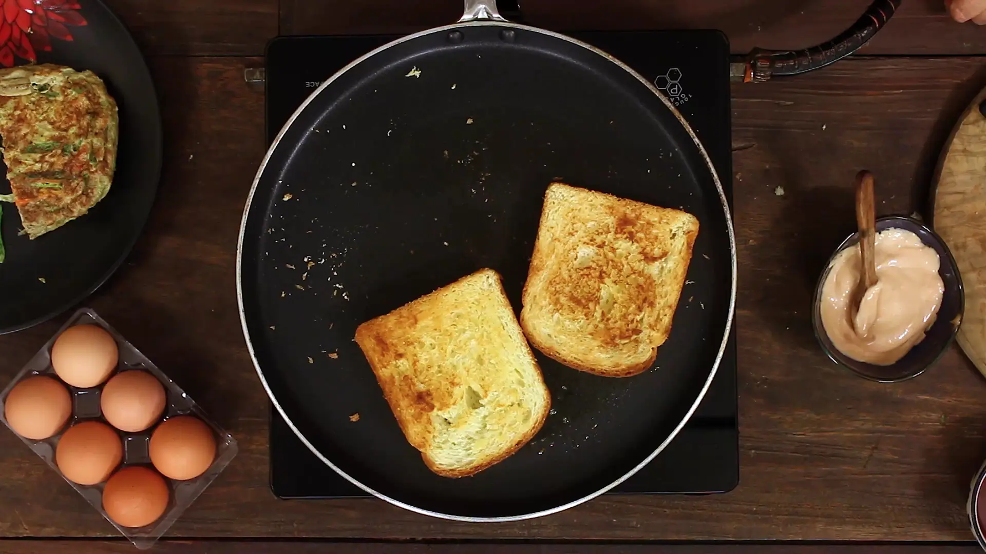 Layer in this order: toasted bread, mayo‑ketchup spread, warm omelette, cheese slice, another smear of mayo-ketchup, a second omelette piece, another cheese slice, one more dollop of mayo-ketchup, and top with the second bread slice. Press gently to seal. - Final Sear (Optional):