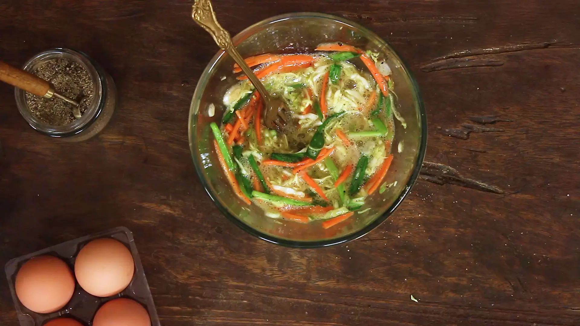 In a bowl,add the grated carrot, shredded cabbage, sliced spring onions, spring onion stalks, salt, pepper,and crack the eggs . Mix everything until well combined.