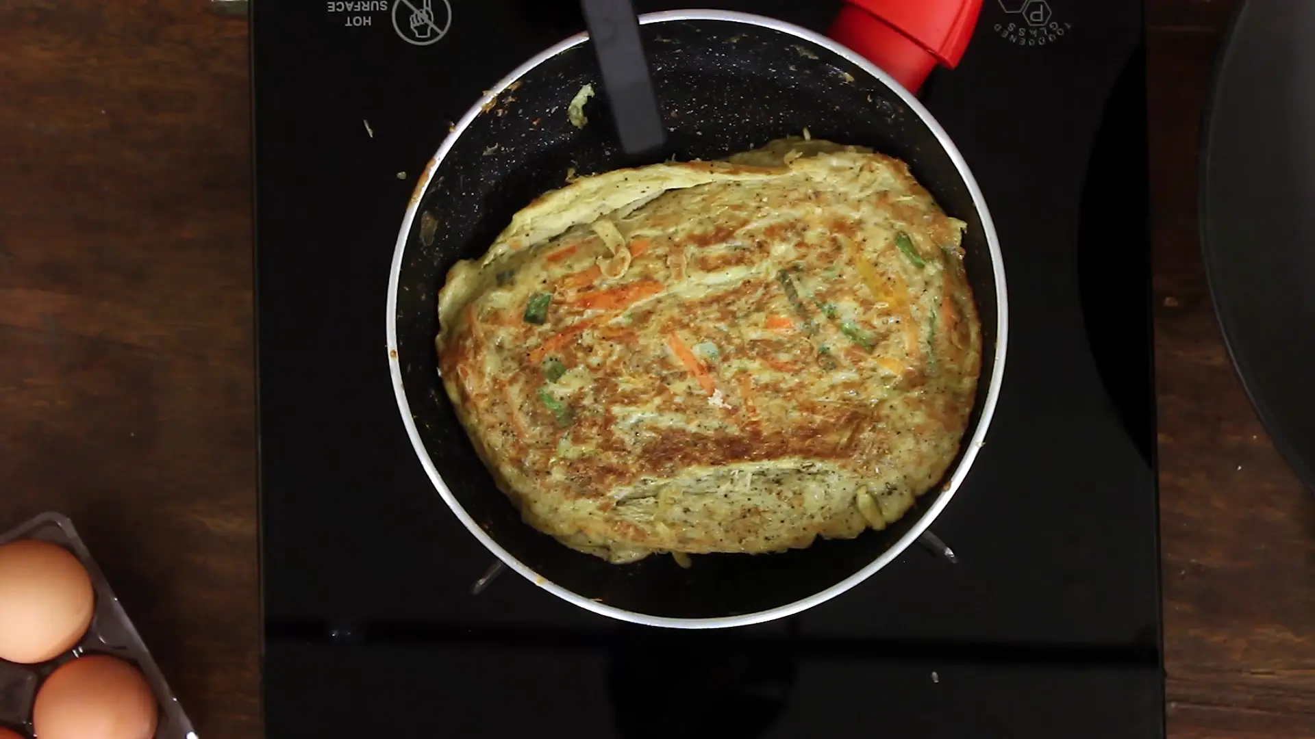Crack eggs over the veggie mix and stir to combine. Heat oil in a nonstick pan, pour in the egg-vegetable batter, and cook until set on one side. Flip carefully and finish until fully cooked but still tender. - Toast the Brioche:
