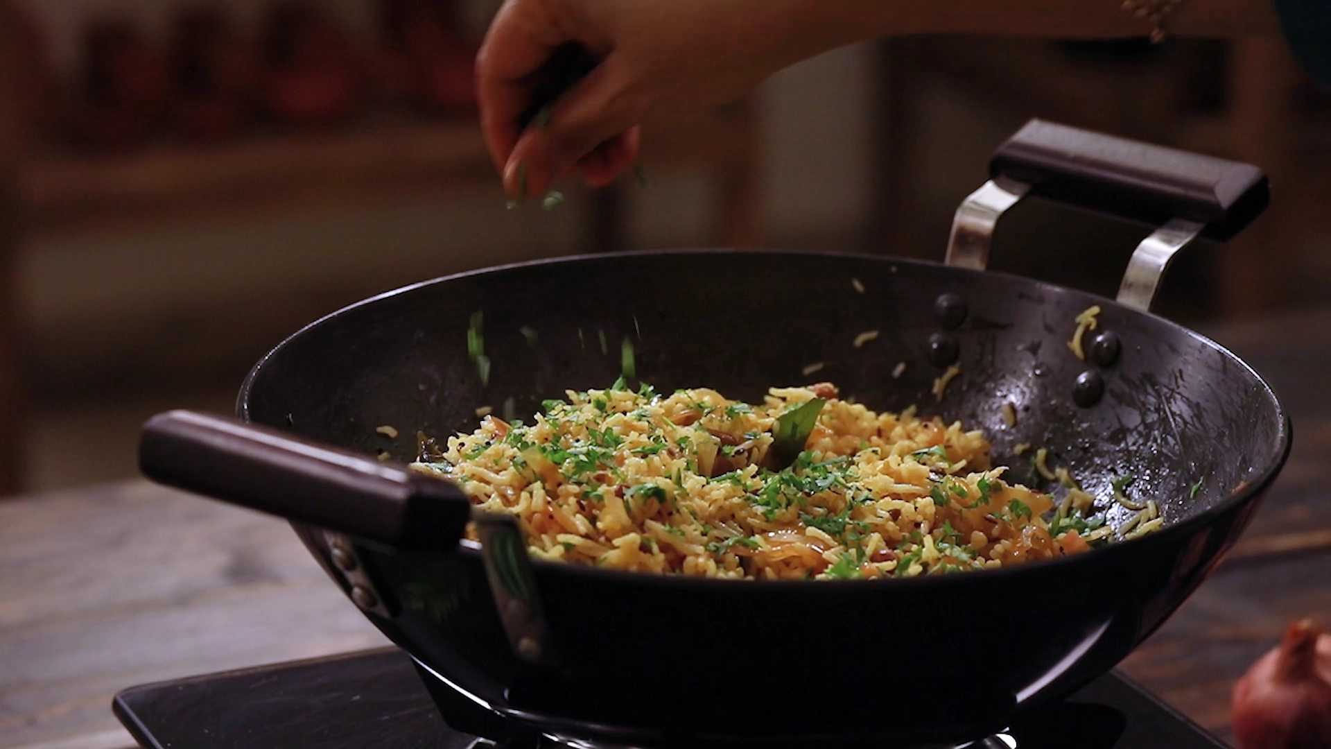 Sprinkle the chopped coriander leaves, give a final toss, and turn off the heat. -