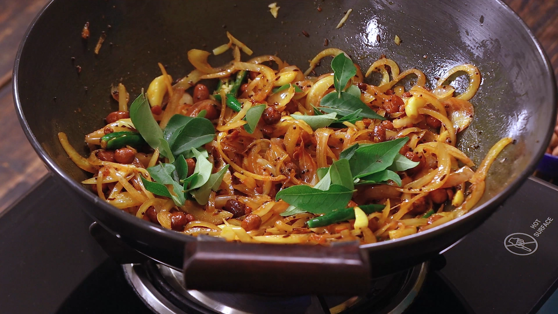 Sprinkle in turmeric, chili powder, a pinch of asafoetida, and salt. Stir in chopped green chilies for a playful kick, then toss in fresh curry leaves and tamarind puree, followed by a splash of water. Cover and steam‑cook this spice‑rich masala for about 4 minutes—this melds the flavors into a cohesive sauce.